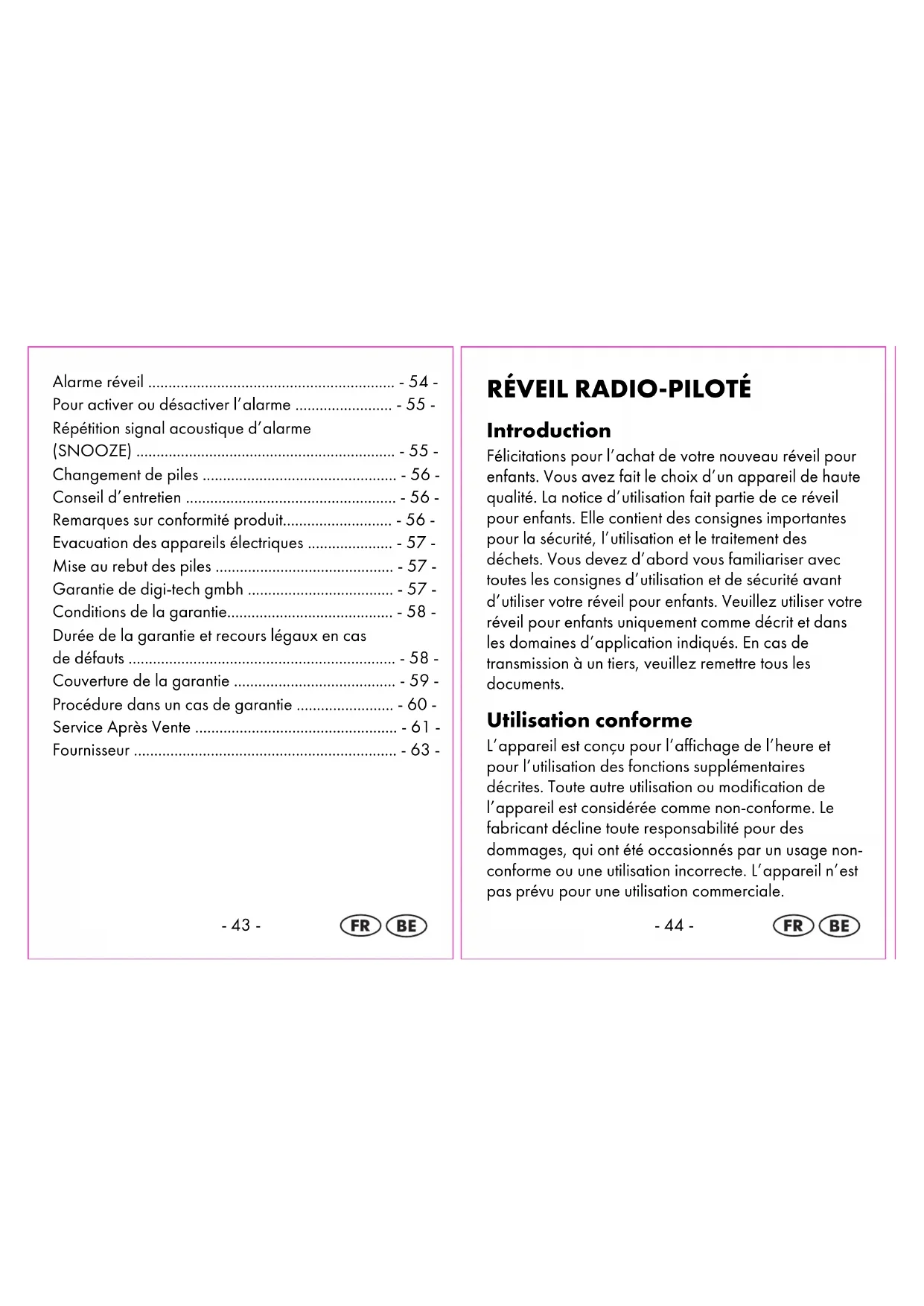 Evacuation des appareils électriques Cet appareil ne doit pas être évacué avec les déchets ménagers. Veuillez faire évacuer votre réveil par l’intermédiaire d’un prestataire agréé ou par votre décharge municipale. Respectez les directives d’évacuation en vigueur. En cas de doute, demandez conseil auprès de votre décharge municipale. Mise au rebut des piles Veuillez vous débarrasser des piles dans les réceptacles prévus à cet effet dans le commerce. Les piles ne font pas partie des ordures ménagères courantes. Veuillez vous débarrasser des piles auprès d’une usine de traitement des déchets ou bien auprès de votre déchetterie communale. Veillez bien à respecter les consignes actuelles en cours de validité. En cas de doute, veuillez prendre contact avec votre déchetterie. Garantie de digi-tech gmbh Vous recevez une garantie de 3 ans à partir de la date d’achat de cet appareil. En cas de défauts sur cet appareil, vous bénéficiez de recours légaux contre le