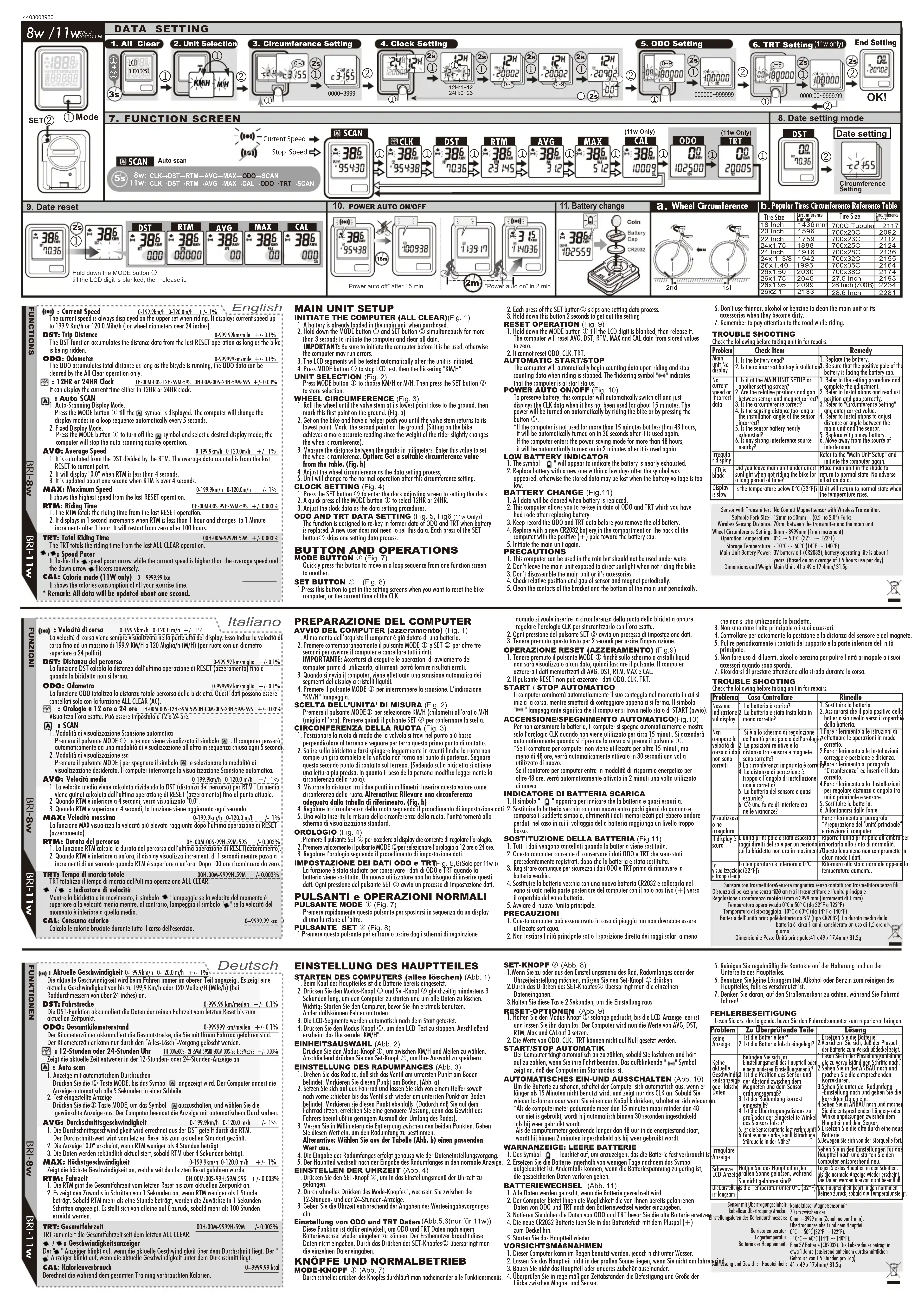 Hold down the MODE button till the LCD digit is blanked, then release it.DSTRTMAVGMAXCAL“Power auto on” in 2 min15m15m2m2mCircumference Nunber POWER AUTO ON/OFF11. Battery change9. Date resetEnglishNessuna indicazione sul display Non compare la velocità di corsa o i dati non sono correttiVisualizzazio ne irregolareIl display è scuro visualizzazione è troppo lentaTROUBLE SHOOTING Check the following before taking unit in for repairs. Problema Cosa Controllare Rimedio1. La batteria è scarica?2. La batteria è stata installata in modo corretto?1. Si è allo schermo di regolazione dell’unità principale o dell’orologio?2. Le posizioni relative e la distanza tra sensore e magnete sono corrette?3.La circonferenza impostata è corretta?4. La distanza di percezione è troppa o l’angolo di installazione non è corretto?5. La batteria del sensore è quasi esaurita?6. C’è una fonte di interferenza nelle vicinanze?L’unità principale è stata esposta ai raggi diretti del sole per un periodo in cui la bicicletta non era in movimento?La temperatura è inferiore a 0°C (32°F)? 1. Sostituire la batteria.2. Assicurarsi che il polo positivo della batteria sia rivolto verso il coperchio della batteria.1.Fare riferimento alle istruzioni di effettuare le operazioni in modo corretto.2.Fare riferimento alle Installazioni correggere posizione e distanza.3.Fare riferimento al paragrafo “Circonferenza” ed inserire il dato corretto.4.Fare riferimento alla Installazioni per regolare distanza o angolo tra unità principale e sensore.5. Sostituire la batteria.6. Allontanarsi dalla fonte.Fare riferimento al paragrafo “Preparazione dell’unità principale” e riavviare il computerRiporre l’unità principale all’ombra per riportarla allo stato di normalità.Questo fenomeno non compromette in alcun modo i dati.Ritornerà allo stato normale appena la temperatura aumenta.TROUBLE SHOOTING Problem Check Item Remedy Check the following before taking unit in for repairs. 1. Replace the battery.2. Be sure that the positive pole of the battery is facing the battery cap.1. Refer to the setting procedure and complete the adjustment.2. Refer to Installations and readjust position and gap correctly.3. Refer to "Circumference Setting" and enter correct value.4. Refer to Installations to adjust distance or angle between the main unit and the sensor.5. Replace with a new battery.6. Move away from the source of interference.Refer to the "Main Unit Setup" and initiate the computer again.Place main unit in the shade to return to normal state. No adverse effect on data.Unit will return to normal state when the temperature rises.Main unit No display current speed orIncorrect data Irregular displayLCD is blackDisplay is slow1. Is the battery dead?2. Is there incorrect battery installation?1. Is it at the MAIN UNIT SETUP or another setting screen?2. Are the relative positions and gap between sensor and magnet correct?3. Is the circumference correct?4. Is the sensing distance too long or the installation angle of the sensor incorrect?5. Is the sensor battery nearly exhausted?6. Is any strong interference source nearby?Did you leave main unit under direct sunlight when not riding the bike for a long period of time?Is the temperature below 0°C (32°F)?Sensor with Transmitter:Suitable Fork Size:Wireless Sensing Distance:Wheel Circumference Setting:Operation Temperature:Storage Temperature:Main Unit Battery Power:Dimensions and WeighNo Contact Magnet sensor with Wireless Transmitter.12mm to 50mm (0.5" to 2.0") Forks.70cm between the transmitter and the main unit.0mm - 3999mm (1mm increment)0°C ~ 50°C (32°F ~ 122°F)- 10°C ~ 60°C (14°F ~ 140°F)3V battery x 1 (CR2032), battery operating life is about 1 years. (Based on an average of 1.5 hours use per day)Main Unit: 41 x 49 x 17.4mm/ 31.5g BRI-11w che non si stia utilizzando la bicicletta.3. Non smontare l nità principale o i suoi accessori.4. Controllare periodicamente la posizione e la distanza del sensore e del magnete.5. Pulire periodicamente i contatti del supporto e la parte inferiore dell nità principale.6. Non fare uso di diluenti, alcool o benzina per pulire l nità principale o i suoi accessori quando sono sporchi.7. Ricordarsi di prestare attenzione alla strada durante la corsa.BRI-8w BRI-11wBRI-8w BRI-11w5. Reinigen Sie regelmäßig die Kontakte auf der Halterung und an der Unterseite des Hauptteiles.6. Benutzen Sie keine Lösungsmittel, Alkohol oder Benzin zum reinigen des Hauptteiles, falls es verschmutzt ist.7. Denken Sie daran, auf den Straßenverkehr zu achten, während Sie Fahrrad fahren! Sensore con trasmettitore:Distanza di percezione senza filo:Regolazione circonferenza ruota:Temperatura operativa: Temperatura di stoccaggio:Batteria dell’unità principale:Dimensioni e Peso: Sensore magnetico senza contatti con trasmettitore senza fili.70 cm tra il trasmettitore e l’unità principaleda 0 mm a 3999 mm (incrementi di 1 mm)da 0°C a 50° C (da 32°F a 122°F)da -10°C a 60°C (da 14°F a 140°F)1 batteria da 3 V (tipo CR2032). La durata media dellabatteria è circa 1 anni, considerato un uso di 1,5 ore al giorno.Unità principale:41 x 49 x 17.4mm/ 31.5g Sensor mit Übertragungseinheit:kabellose Übertragungsstrecke:Einstellungsdaten des Reifendurchmessers:Betriebstemperatur:Lagertemperatur:Batterie der Haupteinheit:Abmessung und Gewicht: Haupteinheit:kontaktloser Magnetsensor mit 70 cm zwischen der0mm – 3999 mm (Zunahme um 1 mm). Übertragungseinheit und dem Hauptteil.0°C ~ 50°C (32°F ~ 122°F).- 10°C ~ 60°C (14°F ~ 140°F).Eine 3V Batterie (CR2032). Die Lebensdauer beträgt in etwa 1 Jahre (basierend auf einem durchschnittlichen Gebrauch von 1.5 Stunden pro Tag).41 x 49 x 17.4mm/ 31.5g keine Anzeige Keine aktuelleGeschwindig-keitsanzeige oder falsche DatenIrreguläre Anzeige Schwarze LCD-Anzeige DieDarstellung ist langsamFEHLERBESEITIGUNG Lesen Sie erst das folgende, bevor Sie den Fahrradcomputer zum reparieren bringen.1.Ersetzen