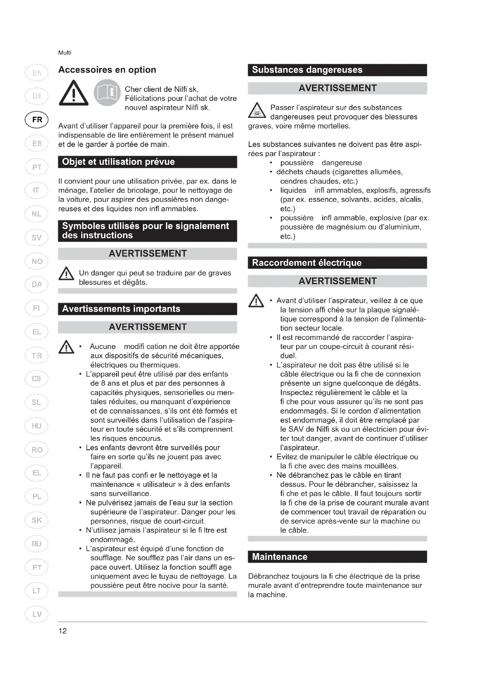 Accessoires en option Cher client de Nilfi sk, Félicitations pour l’achat de votre nouvel aspirateur Nilfi sk. Avant d’utiliser l’appareil pour la première fois, il est indispensable de lire entièrement le présent manuel et de le garder à portée de main. Objet et utilisation prévue Il convient pour une utilisation privée, par ex. dans le ménage, l’atelier de bricolage, pour le nettoyage de la voiture, pour aspirer des poussières non dange- reuses et des liquides non infl ammables. Symboles utilisés pour le signalement des instructions AVERTISSEMENT Un danger qui peut se traduire par de graves blessures et dégâts. Avertissements importants AVERTISSEMENT