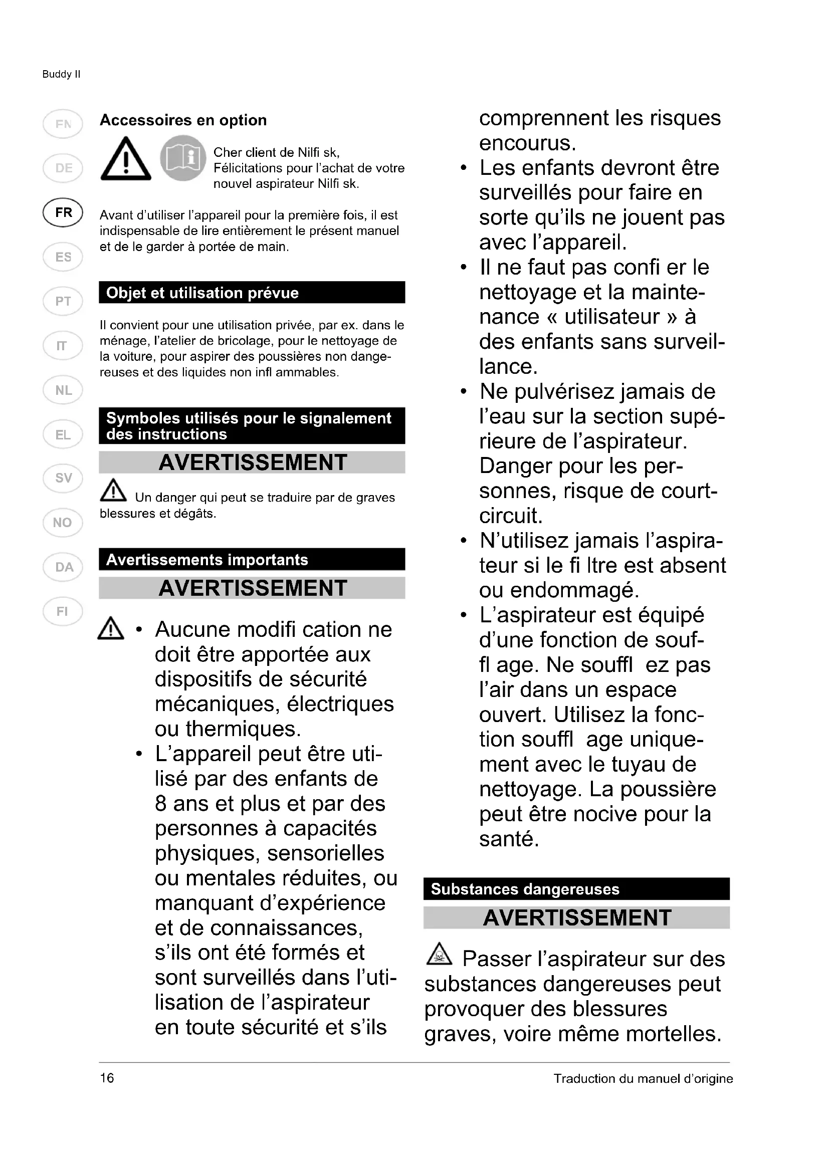 - Ne débranchez pas le câble en tirant dessus. Pour le débrancher, sai- sissez la fi che et pas le câble. Il faut toujours sortir la fi che de la prise de courant murale avant de commencer tout tra- vail de réparation ou de service après-vente sur la machine ou le câble. Maintenance Débranchez toujours la fi che électrique de la prise murale avant d’entreprendre toute maintenance sur la machine. Recyclage de l’aspirateur Les matériaux d’emballage peuvent être recyclés. Veuillez recycler les pièces au lieu de les jeter dans vos ordures ména- gères. Vous pouvez aussi remettre directe- ment l’emballage à votre magasin Nilfi sk pour qu’il le recycle adéquatement. Comme précisé dans la Directive WEEE 2012/19/ EC sur les appareils électriques et électroniques usagés, les équipements électriques usés doivent être collectés séparément et recyclés de manière écologique. Contactez votre administration locale ou18 Traduction du manuel d’origine Buddy II