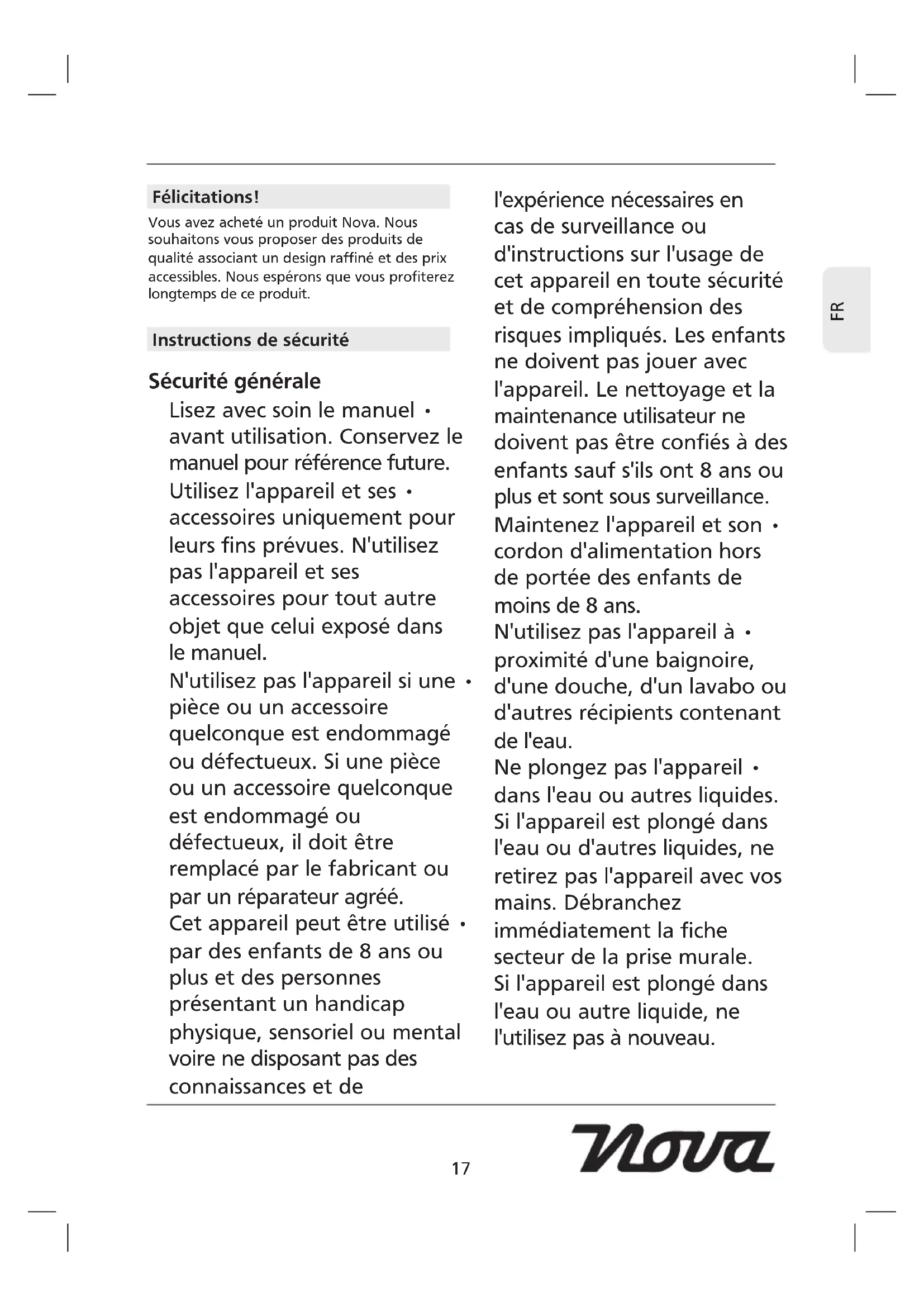 Félicitations! Vous avez acheté un produit Nova. Nous souhaitons vous proposer des produits de qualité associant un design raffiné et des prix accessibles. Nous espérons que vous profiterez longtemps de ce produit. Instructions de sécurité Sécurité générale Lisez avec soin le manuel • avant utilisation. Conservez le manuel pour référence future. Utilisez l'appareil et ses • accessoires uniquement pour leurs fins prévues. N'utilisez pas l'appareil et ses accessoires pour tout autre objet que celui exposé dans le manuel. N'utilisez pas l'appareil si une • pièce ou un accessoire quelconque est endommagé ou défectueux. Si une pièce ou un accessoire quelconque est endommagé ou défectueux, il doit être remplacé par le fabricant ou par un réparateur agréé. Cet appareil peut être utilisé • par des enfants de 8 ans ou plus et des personnes présentant un handicap physique, sensoriel ou mental voire ne disposant pas des connaissances et de l'expérience nécessaires en cas de surveillance ou d'instructions sur l'usage de cet appareil en toute sécurité et de compréhension des risques impliqués. Les enfants ne doivent pas jouer avec l'appareil. Le nettoyage et la maintenance utilisateur ne doivent pas être confiés à des enfants sauf s'ils ont 8 ans ou plus et sont sous surveillance. Maintenez l'appareil et son • cordon d'alimentation hors de portée des enfants de moins de 8 ans. N'utilisez pas l'appareil à • proximité d'une baignoire, d'une douche, d'un lavabo ou d'autres récipients contenant de l'eau. Ne plongez pas l'appareil • dans l'eau ou autres liquides. Si l'appareil est plongé dans l'eau ou d'autres liquides, ne retirez pas l'appareil avec vos mains. Débranchez immédiatement la fiche secteur de la prise murale. Si l'appareil est plongé dans l'eau ou autre liquide, ne l'utilisez pas à nouveau.18
