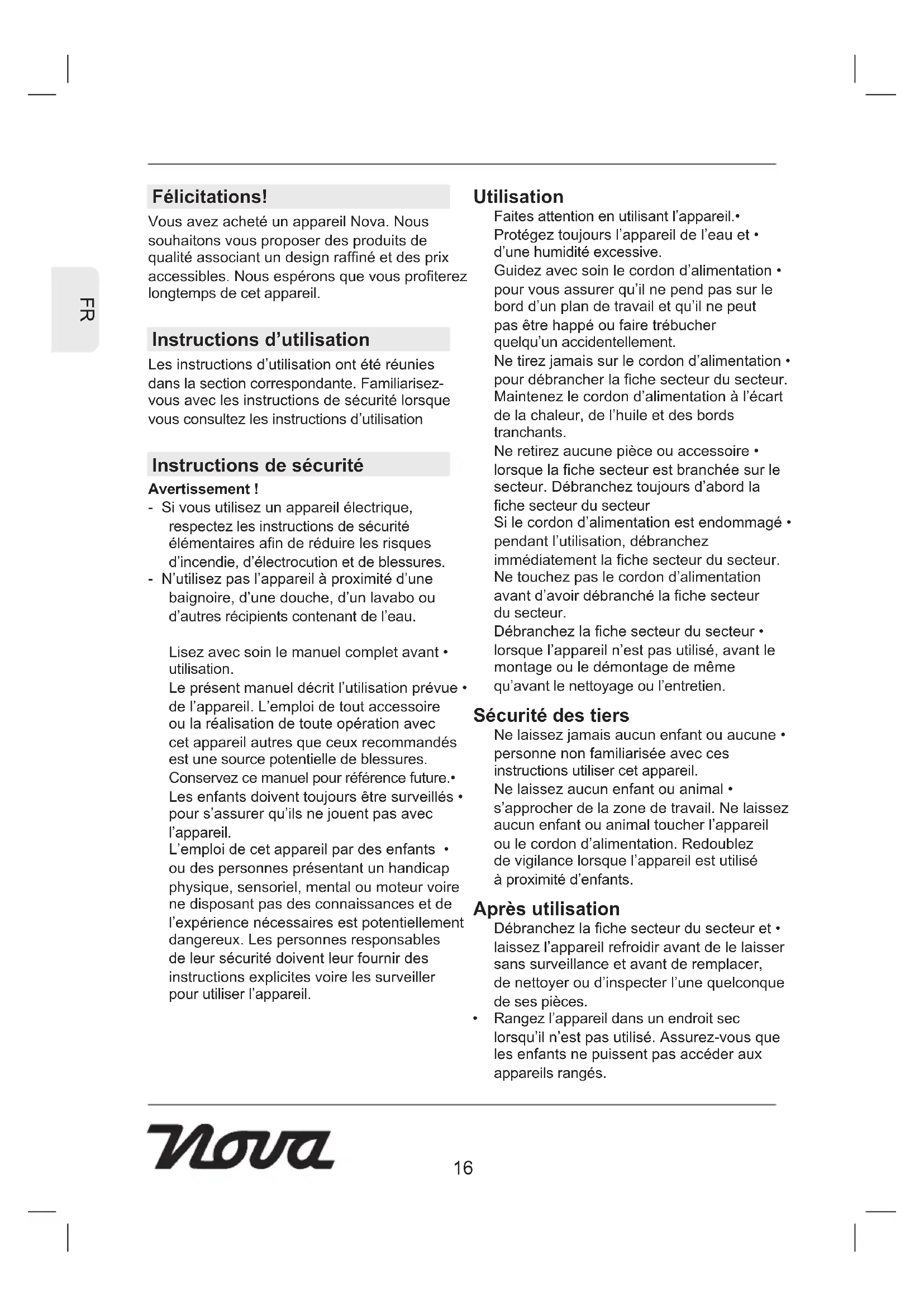 Félicitations! Vous avez acheté un appareil Nova. Nous souhaitons vous proposer des produits de qualité associant un design raffiné et des prix accessibles. Nous espérons que vous profiterez longtemps de cet appareil. Instructions d’utilisation Les instructions d’utilisation ont été réunies dans la section correspondante. Familiarisez- vous avec les instructions de sécurité lorsque vous consultez les instructions d’utilisation Instructions de sécurité Avertissement ! - Si vous utilisez un appareil électrique, respectez les instructions de sécurité élémentaires afin de réduire les risques d’incendie, d’électrocution et de blessures. - N’utilisez pas l’appareil à proximité d’une baignoire, d’une douche, d’un lavabo ou d’autres récipients contenant de l’eau. Lisez avec soin le manuel complet avant • utilisation. Le présent manuel décrit l’utilisation prévue • de l’appareil. L’emploi de tout accessoire ou la réalisation de toute opération avec cet appareil autres que ceux recommandés est une source potentielle de blessures. Conservez ce manuel pour référence future.• Les enfants doivent toujours être surveillés • pour s’assurer qu’ils ne jouent pas avec l’appareil. L’emploi de cet appareil par des enfants • ou des personnes présentant un handicap physique, sensoriel, mental ou moteur voire ne disposant pas des connaissances et de l’expérience nécessaires est potentiellement dangereux. Les personnes responsables de leur sécurité doivent leur fournir des instructions explicites voire les surveiller pour utiliser l’appareil. Utilisation Faites attention en utilisant l’appareil.• Protégez toujours l’appareil de l’eau et • d’une humidité excessive. Guidez avec soin le cordon d’alimentation • pour vous assurer qu’il ne pend pas sur le bord d’un plan de travail et qu’il ne peut pas être happé ou faire trébucher quelqu’un accidentellement. Ne tirez jamais sur le cordon d’alimentation • pour débrancher la fiche secteur du secteur. Maintenez le cordon d’alimentation à l’écart de la chaleur, de l’huile et des bords tranchants. Ne retirez aucune pièce ou accessoire • lorsque la fiche secteur est branchée sur le secteur. Débranchez toujours d’abord la fiche secteur du secteur Si le cordon d’alimentation est endommagé • pendant l’utilisation, débranchez immédiatement la fiche secteur du secteur. Ne touchez pas le cordon d’alimentation avant d’avoir débranché la fiche secteur du secteur. Débranchez la fiche secteur du secteur • lorsque l’appareil n’est pas utilisé, avant le montage ou le démontage de même qu’avant le nettoyage ou l’entretien. Sécurité des tiers Ne laissez jamais aucun enfant ou aucune • personne non familiarisée avec ces instructions utiliser cet appareil. Ne laissez aucun enfant ou animal • s’approcher de la zone de travail. Ne laissez aucun enfant ou animal toucher l’appareil ou le cordon d’alimentation. Redoublez de vigilance lorsque l’appareil est utilisé à proximité d’enfants. Après utilisation Débranchez la fiche secteur du secteur et • laissez l’appareil refroidir avant de le laisser sans surveillance et avant de remplacer, de nettoyer ou d’inspecter l’une quelconque de ses pièces. Rangez l’appareil dans un endroit sec • lorsqu’il n’est pas utilisé. Assurez-vous que les enfants ne puissent pas accéder aux appareils rangés.17
