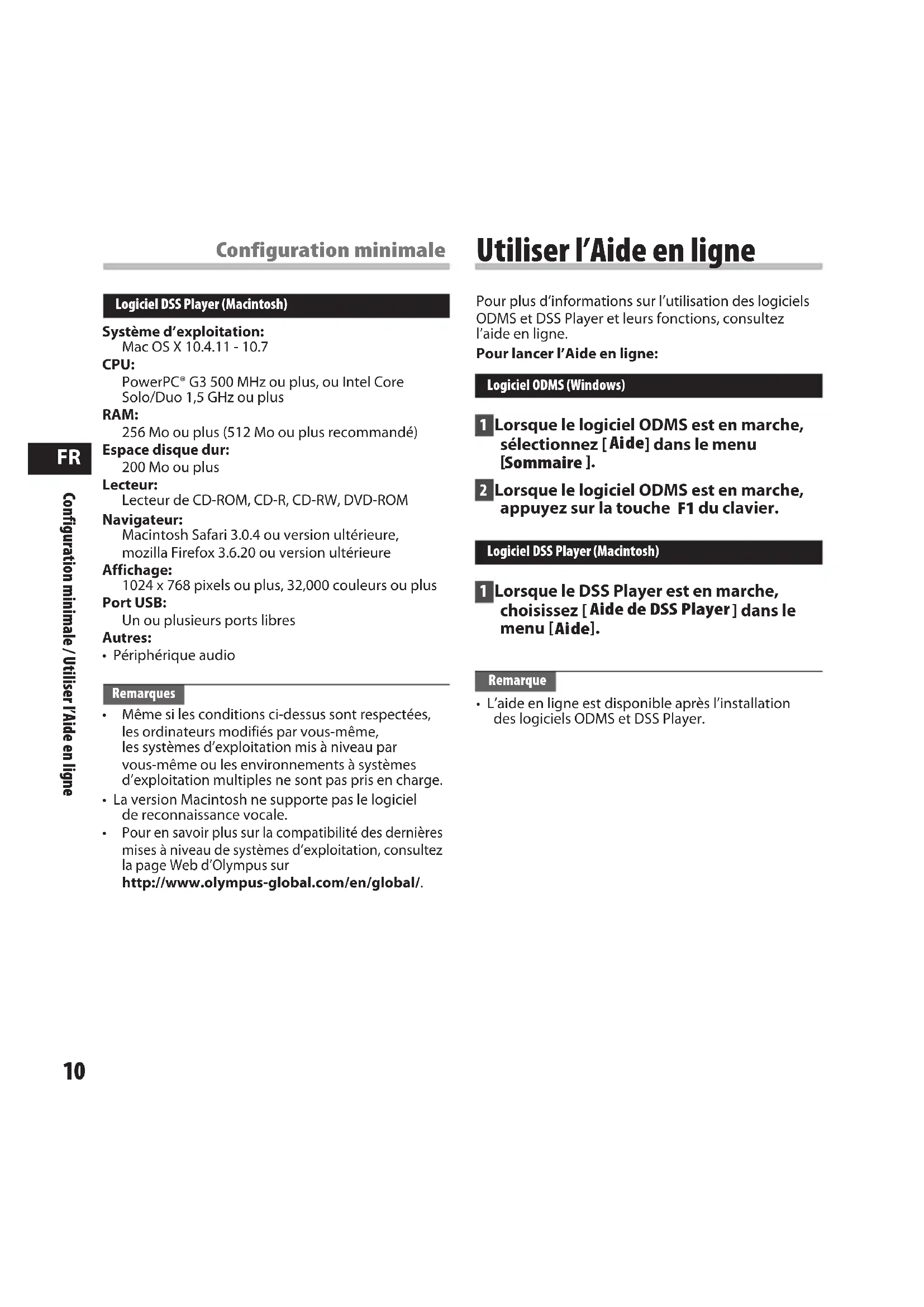 Pour en savoir plus sur la compatibilité des dernières mises à niveau de systèmes d’exploitation, consultez la page Web d’Olympus sur http://www.olympus-global.com/en/global/. Configuration minimale / Utiliser l’Aide en ligne Configuration minimale Utiliser l’Aide en ligne Pour plus d’informations sur l’utilisation des logiciels ODMS et DSS Player et leurs fonctions, consultez l’aide en ligne. Pour lancer l’Aide en ligne: Logiciel ODMS (Windows) 1 Lorsque le logiciel ODMS est en marche, sélectionnez [ Aide ] dans le menu