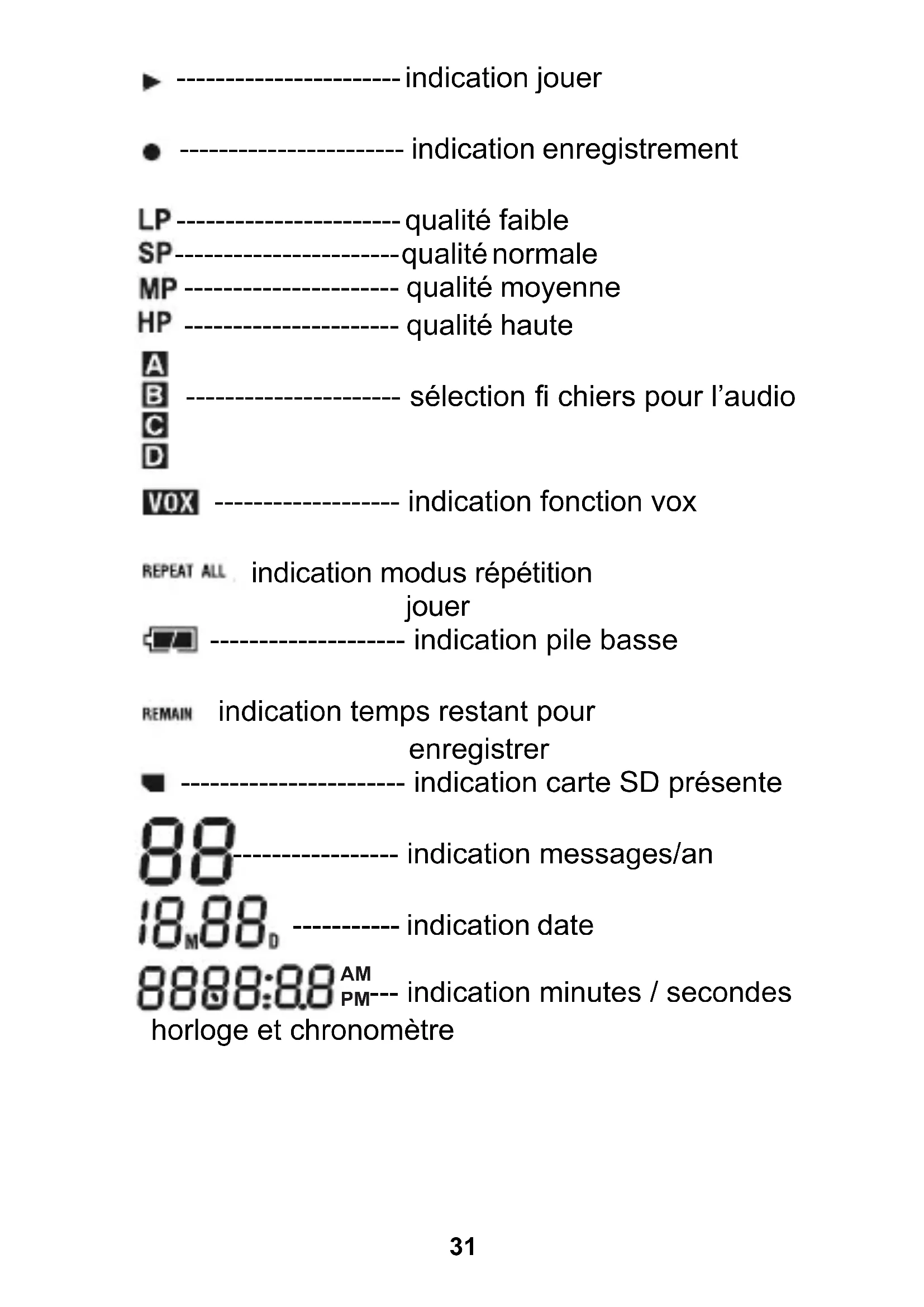 PM31 ----------------------- indication jouer ----------------------- indication enregistrement ----------------------- qualité faible ----------------------- qualité normale ---------------------- qualité moyenne ---------------------- qualité haute ---------------------- sélection chiers pour l’audio ------------------- indication fonction vox indication modus répétition jouer -------------------- indication pile basse indication temps restant pour enregistrer ----------------------- indication carte SD présente --------------------------- indication messages/an ----------- indication date --------------------------- indication minutes / secondes horloge et chronomètre