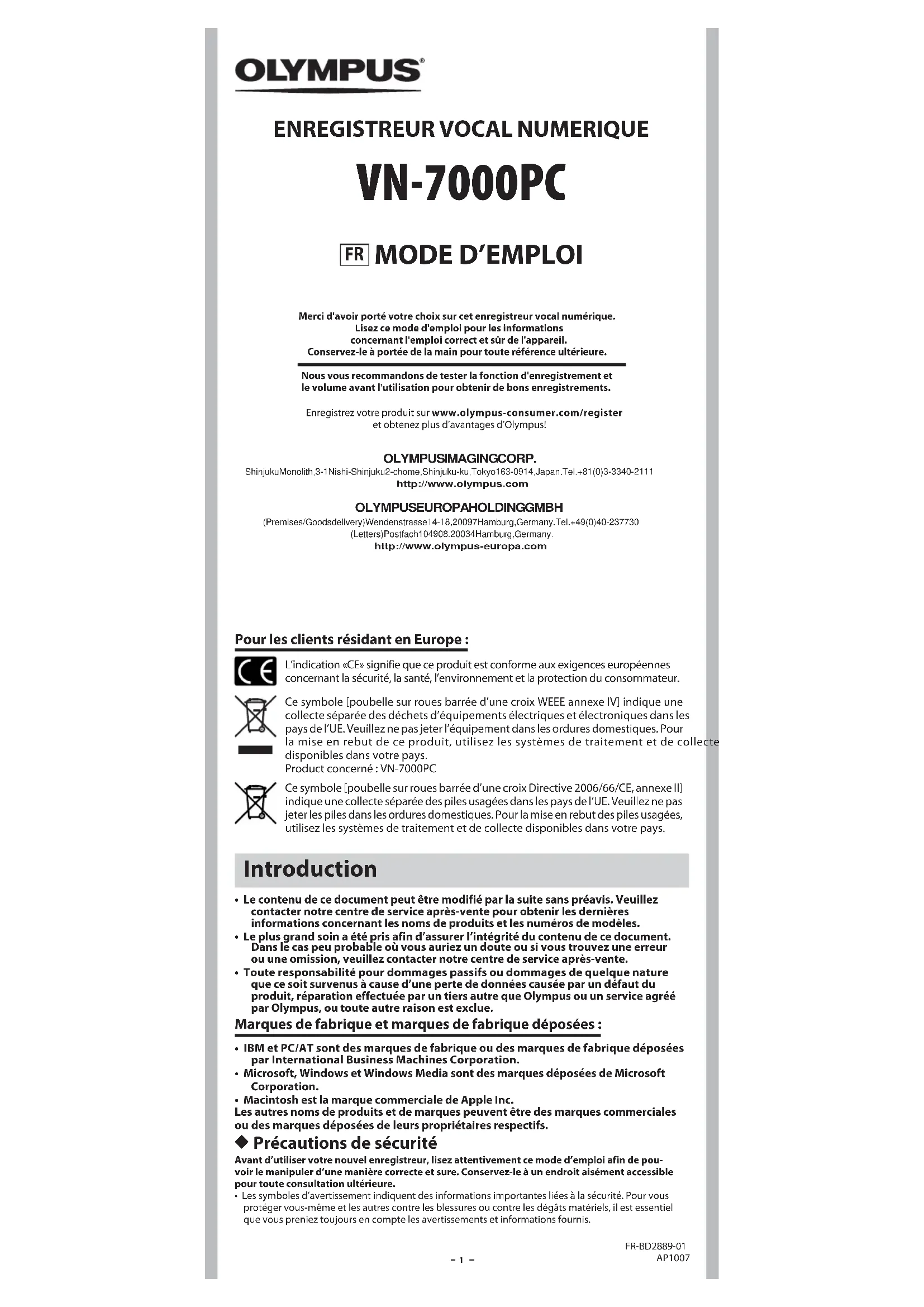 Merci d'avoir porté votre choix sur cet enregistreur vocal numérique. Lisez ce mode d'emploi pour les informations concernant l'emploi correct et sûr de l'appareil. Conservez-le à portée de la main pour toute référence ultérieure. Nous vous recommandons de tester la fonction d'enregistrement et le volume avant l'utilisation pour obtenir de bons enregistrements.Enregistrez votre produit sur www.olympus-consumer.com/registeret obtenez plus d’avantages d’Olympus!(Premises/Goods delivery) Wendenstrasse 14-18, 20097 Hamburg, Germany. Tel. +49 (0)40-237730(Letters) Postfach 10 49 08. 20034 Hamburg, Germany.http://www.olympus-europa.comOLYMPUS EUROP A HOLDING GMBHShinjuku Monolith, 3-1 Nishi-Shinjuku 2-chome, Shinjuku-ku, Tokyo 163-0914, Japan. Tel. +81 (0)3-3340-2111http://www.olympus.comOLYMPUS IMAGING CORP.2
