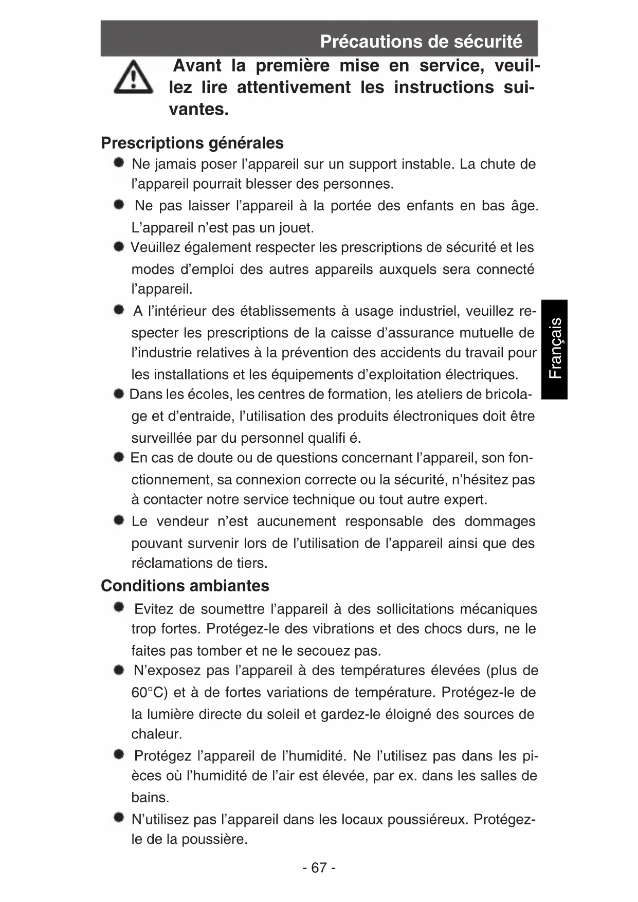 - Le vendeur n'est aucunement responsable des dommages pouvant survenir lors de l'utilisation de l'appareil ainsi que des réclamations de tiers.