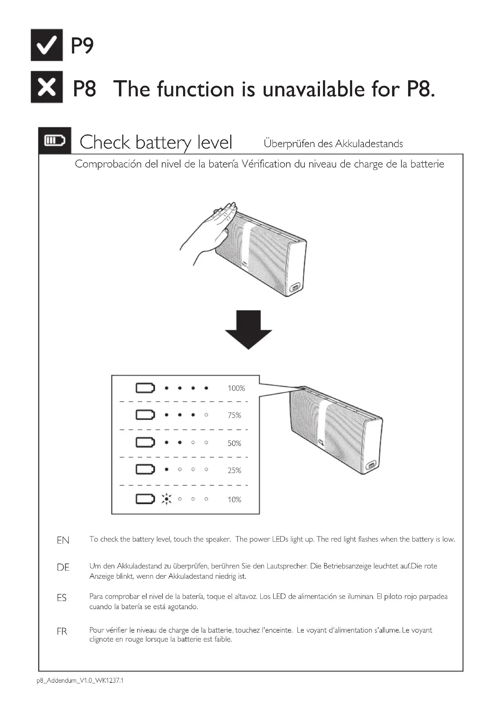 FR Starten Sie nach erfolgreicher Verbindungsherstellung die Musikwiedergabe auf dem Bluetooth-Gerät.Die Musikübertragung kann von Hindernissen zwischen dem Gerät und P8, z.B.einer Wand oder anderen nahegelegenen Geräten, die die gleiche Frequenz verwenden, beeinträchtigt werden.Starten Sie nach erfolgreicher Verbindungsherstellung die Musikwiedergabe auf dem Bluetooth-Gerät.Die Musikübertragung kann von Hindernissen zwischen dem Gerät und P8, z.B.einer Wand oder anderen nahegelegenen Geräten, die die gleiche Frequenz verwenden, beeinträchtigt werden.Une fois la connexion établie, lancez la lecture de la musique sur le périphérique Bluetooth.La diffusion de musique peut être interrompue par la présence d'obstacles entre le périphérique et l'enceinte P8, commedes murs, ou par d'autres appareils à proximité fonctionnant sur la même fréquence.