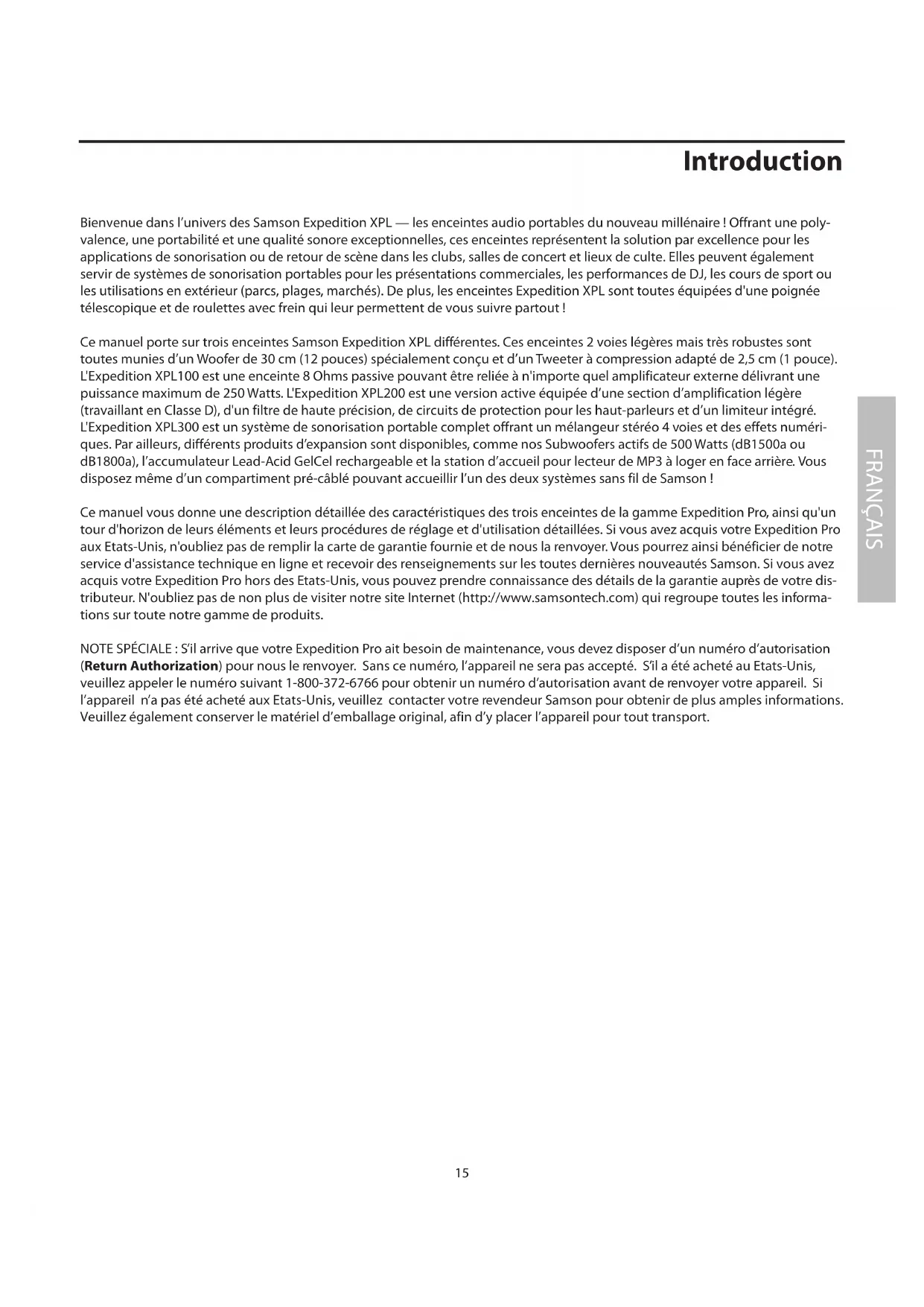 Ce manuel vous donne une description détaillée des caractéristiques des trois enceintes de la gamme Expedition Pro, ainsi qu’un tour d’horizon de leurs éléments et leurs procédures de réglage et d’utilisation détaillées. Si vous avez acquis votre Expedition Pro aux États-Unis, n’oubliez pas de remplir la carte de garantie fournie et de nous la renvoyer. Vous pourrez ainsi bénéficier de notre service d’assistance technique en ligne et recevoir des renseignements sur les toutes dernières nouvelles Samson. Si vous avez acquis votre Expedition Pro hors des États-Unis, vous pouvez prendre connaissance des détails de la garantie auprès de votre distributeur. N’oubliez pas de visiter notre site Internet (http://www.samsontech.com) qui regroupe toutes les informations sur toute notre gamme de produits.