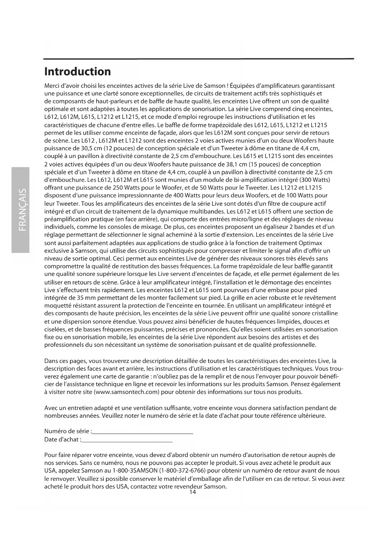 Dans ces pages, vous trouverez une description détaillée de toutes les caractéristiques des enceintes Live, la description des faces avant et arrière, les instructions d'utilisation et les caractéristiques techniques. Vous trouverez également une carte de garantie : n'oubliez pas de la remplir et de nous l'envoyer pour pouvoir bénéficier de l'assistance technique en ligne et recevoir les informations sur les produits Samson. Pensez également à visiter notre site (www.samsontech.com) pour obtenir des informations sur tous nos produits.