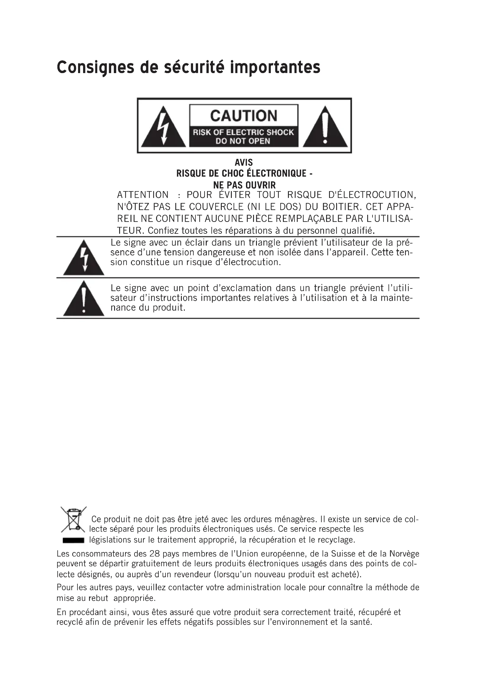 Ce produit ne doit pas être jeté avec les ordures ménagères. Il existe un service de col- lecte séparé pour les produits électroniques usés. Ce service respecte les législations sur le traitement approprié, la récupération et le recyclage. Les consommateurs des 28 pays membres de l’Union européenne, de la Suisse et de la Norvège peuvent se départir gratuitement de leurs produits électroniques usagés dans des points de col- lecte désignés, ou auprès d’un revendeur (lorsqu’un nouveau produit est acheté). Pour les autres pays, veuillez contacter votre administration locale pour connaître la méthode de mise au rebut appropriée. En procédant ainsi, vous êtes assuré que votre produit sera correctement traité, récupéré et recyclé afin de prévenir les effets négatifs possibles sur l’environnement et la santé.Consignes de sécurité importantes