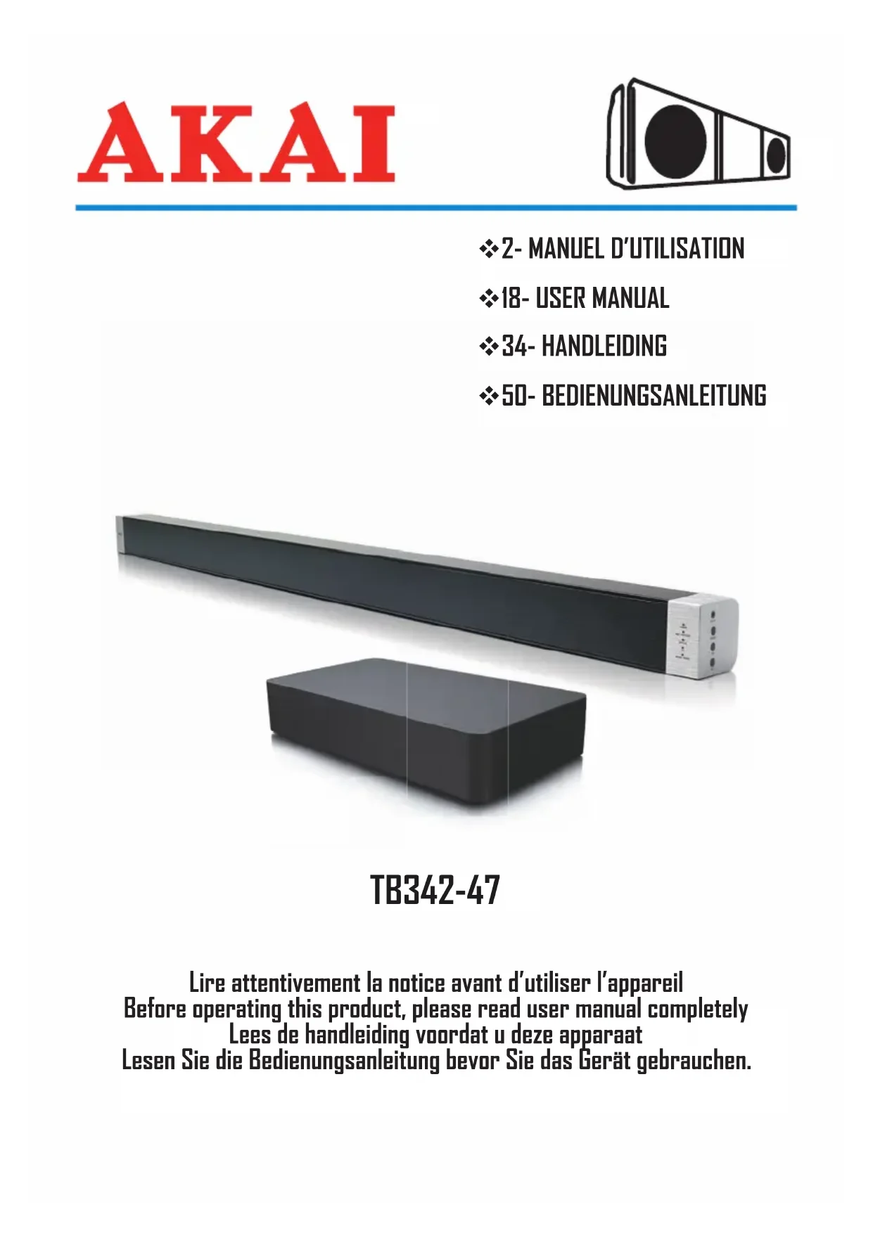 Merci d'avoir acheté notre AKAI TB342-47 : UNE BARRE DE SON BLUETOOTH AVEC SUBWOOFER SANS FIL.