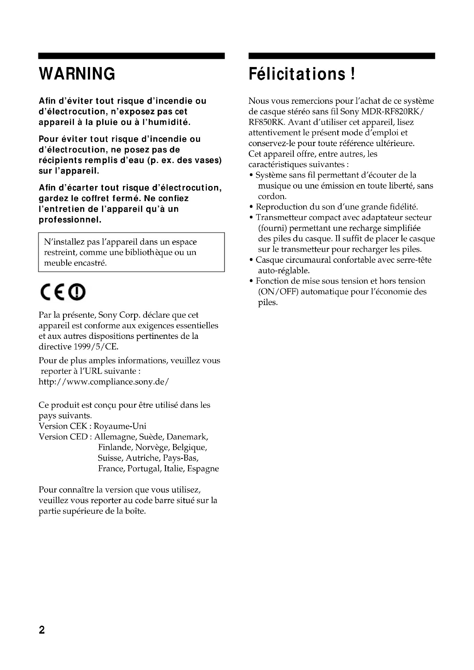 que ou un meuble encastré. Par la présente, Sony Corp. déclare que cet appareil est conforme aux exigences essentielles et aux autres dispositions pertinentes de la directive 1999/5/CE. Pour de plus amples informations, veuillez vous reporter à l’URL suivante : http://www.compliance.sony.de/ Ce produit est conçu pour être utilisé dans les pays suivants. Version CEK : Royaume-Uni Version CED : Allemagne, Suède, Danemark, Finlande, Norvège, Belgique, Suisse, Autriche, Pays-Bas, France, Portugal, Italie, Espagne Pour connaître la version que vous utilisez, veuillez vous reporter au code barre situé sur la partie supérieure de la boîte. Félicitations ! Nous vous remercions pour l’achat de ce système de casque stéréo sans fil Sony MDR-RF820RK/ RF850RK. Avant d’utiliser cet appareil, lisez attentivement le présent mode d’emploi et conservez-le pour toute référence ultérieure. Cet appareil offre, entre autres, les caractéristiques suivantes :