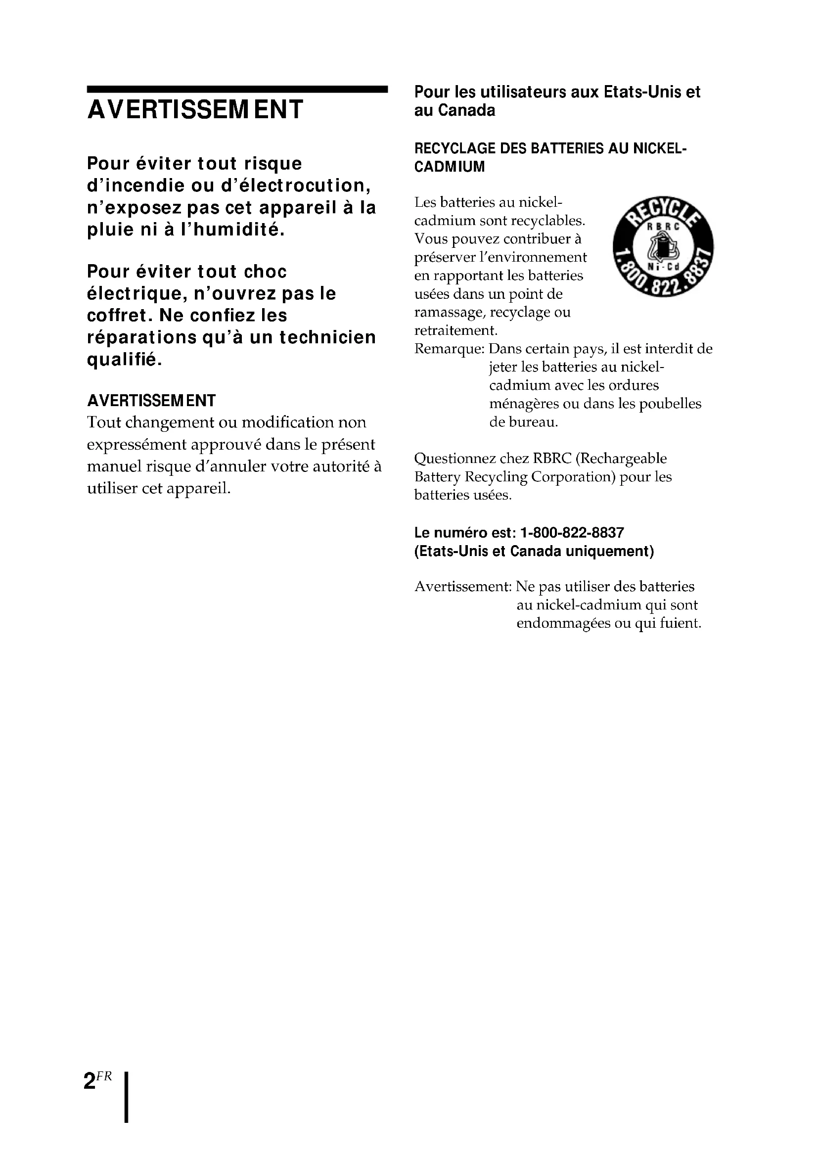 CADMIUM Les batteries au nickel- cadmium sont recyclables. Vous pouvez contribuer à préserver l’environnement en rapportant les batteries usées dans un point de ramassage, recyclage ou retraitement. Remarque: Dans certain pays, il est interdit de jeter les batteries au nickel- cadmium avec les ordures ménagères ou dans les poubelles de bureau. Questionnez chez RBRC (Rechargeable Battery Recycling Corporation) pour les batteries usées. Le numéro est: 1-800-822-8837 (Etats-Unis et Canada uniquement)