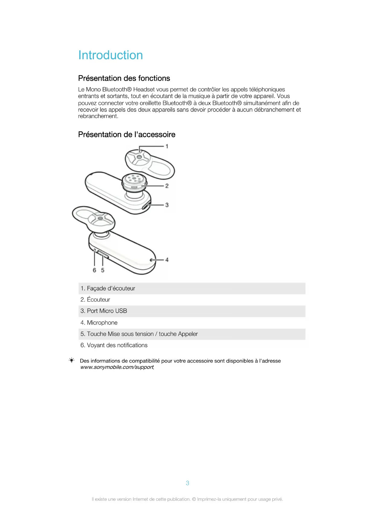 - Declaration of Conformity for MBH20 2Introduction Présentation des fonctions Le Mono Bluetooth® Headset vous permet de contrôler les appels téléphoniques entrants et sortants, tout en écoutant de la musique à partir de votre appareil. Vous pouvez connecter votre oreillette Bluetooth® à deux Bluetooth® simultanément afin de recevoir les appels des deux appareils sans devoir procéder à aucun débranchement et rebranchement. Présentation de l'accessoire p. 10