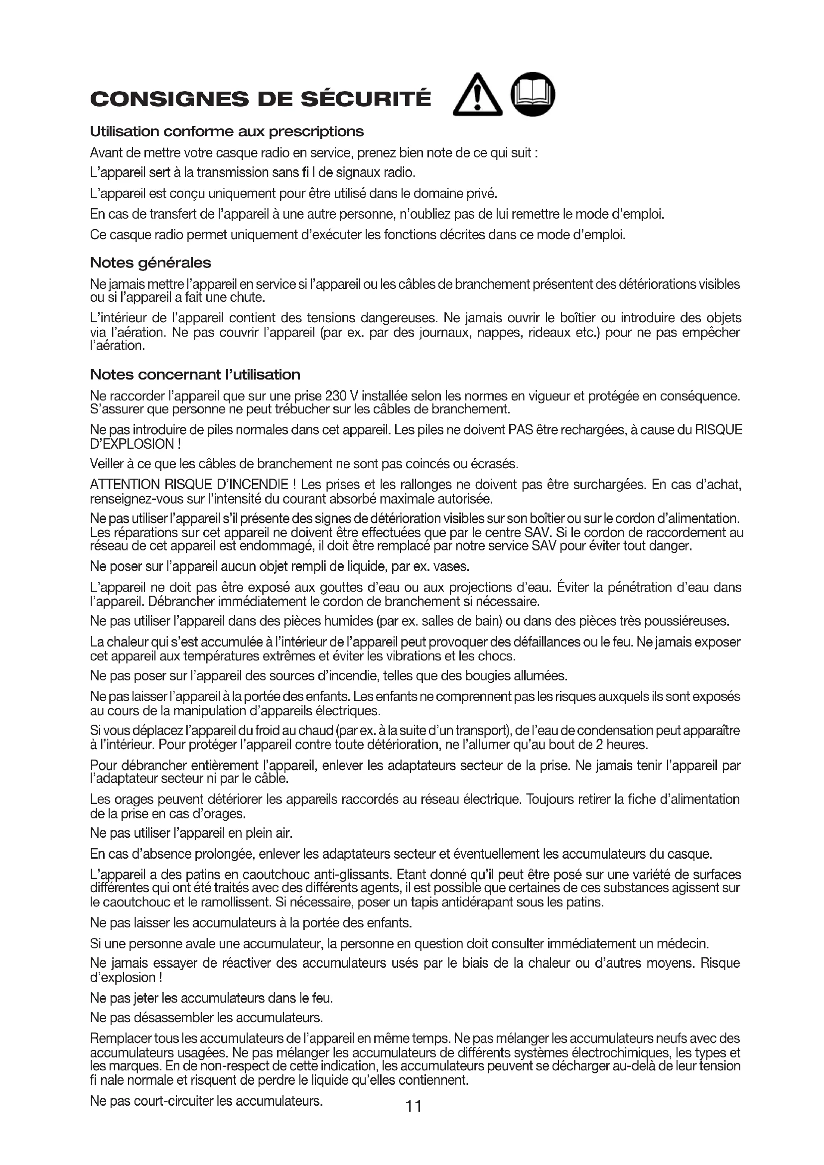 Ce casque radio permet uniquement d'exécuter les fonctions décrites dans ce mode d'emploi.