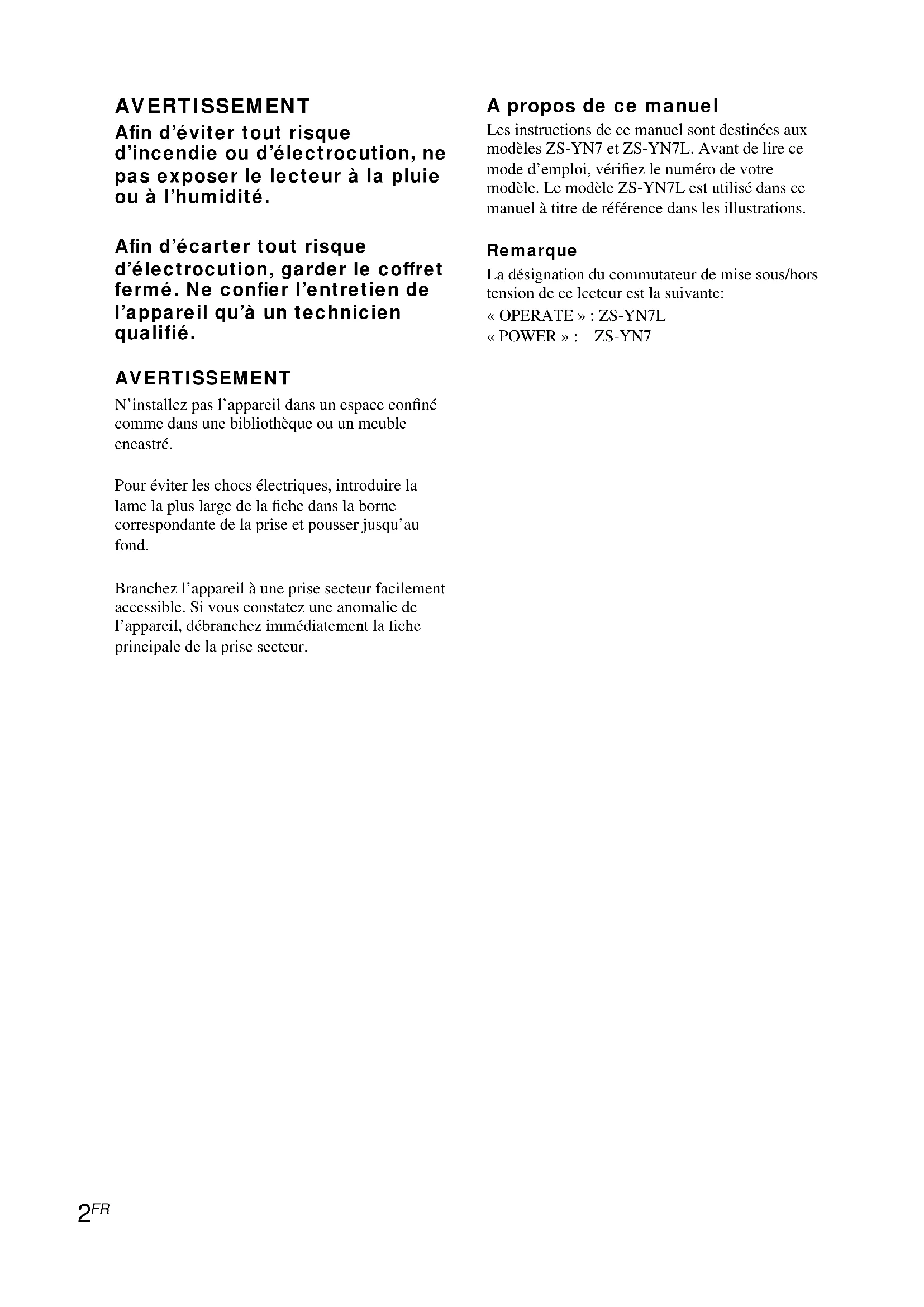 Les instructions de ce manuel sont destinées aux modèles ZS-YN7 et ZS-YN7L. Avant de lire ce mode d'emploi, vérifiez le numéro de votre modèle. Le modèle ZS-YN7L est utilisé dans ce manuel à titre de référence dans les illustrations.