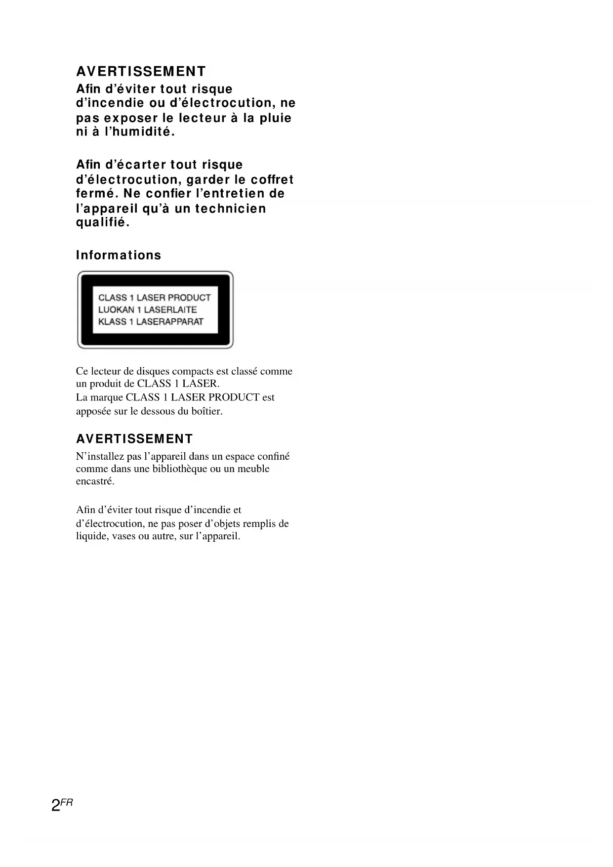 AVERTISSEMENT Afin d’éviter tout risque d’incendie ou d’électrocution, ne pas exposer le lecteur à la pluie ni à l’humidité. Afin d’écarter tout risque d’électrocution, garder le coffret fermé. Ne confier l’entretien de l’appareil qu’à un technicien qualifié. Informations Ce lecteur de disques compacts est classé comme un produit de CLASS 1 LASER. La marque CLASS 1 LASER PRODUCT est apposée sur le dessous du boîtier. AVERTISSEMENT N’installez pas l’appareil dans un espace confiné comme dans une bibliothèque ou un meuble encastré. Afin d’éviter tout risque d’incendie et d’électrocution, ne pas poser d’objets remplis de liquide, vases ou autre, sur l’appareil.Opérations de base