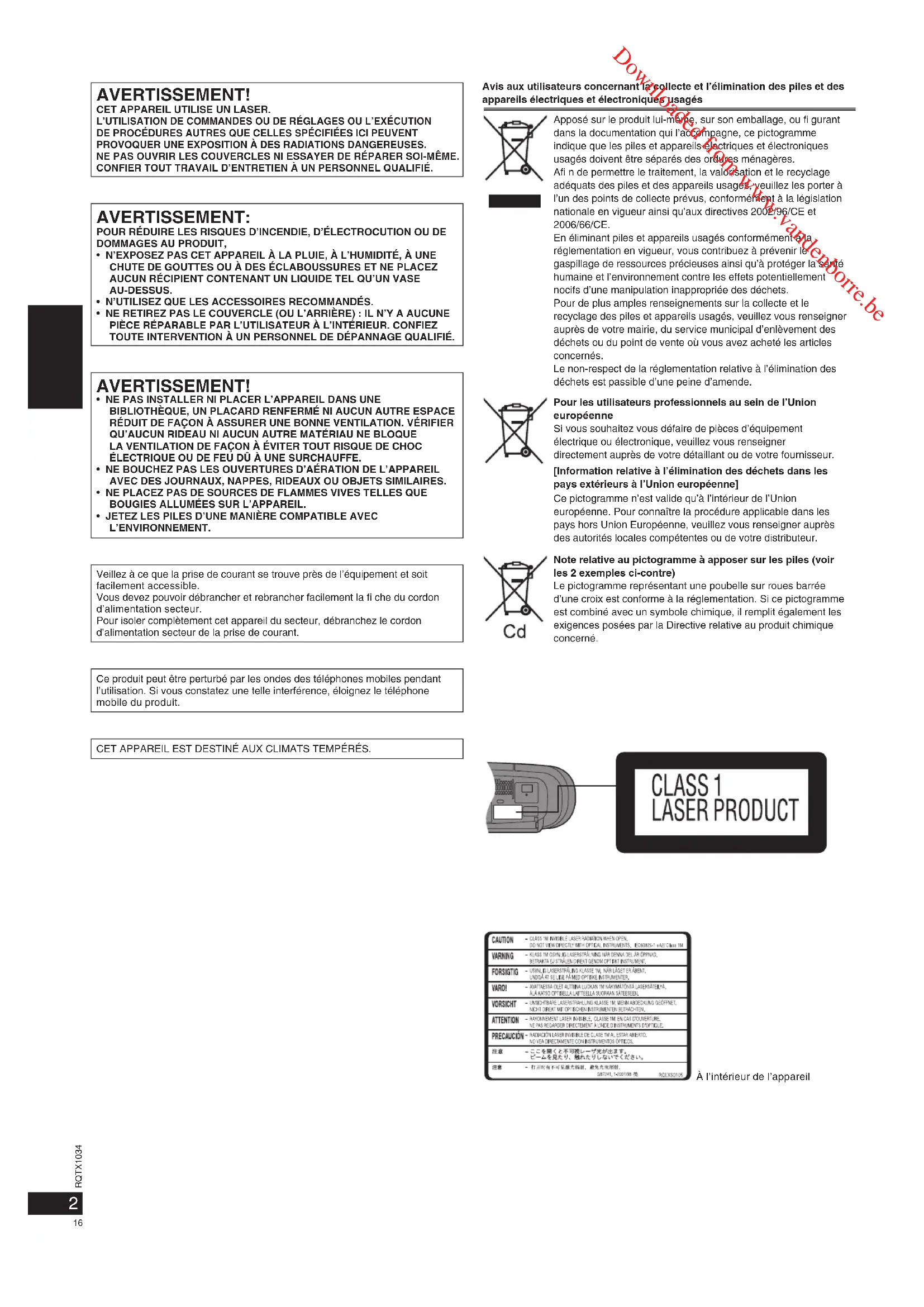 Afin de permettre le traitement, la valorisation et le recyclage adequats des piles et des apparciels usages, veuillez les porter a l'un des points de collecte prevus, conformement à la legislation nationale en vigueur ainsi qu'aux directives 2002/96/CE et 2006/66/CE.