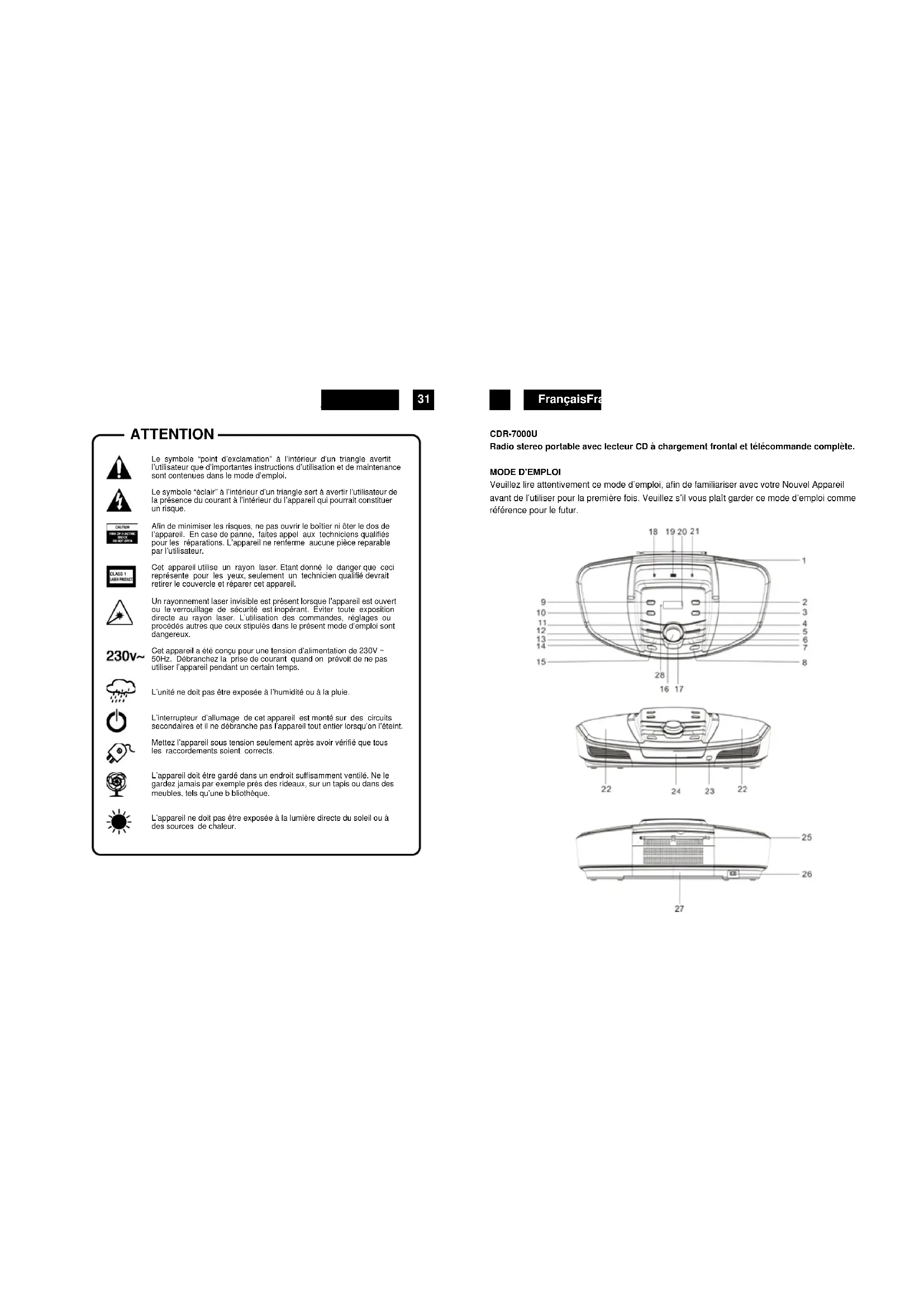 ATTENTION Le symbole “point d’exclamation” à l’intérieur d’un triangle avertit l’utilisateur que d’importantes instructions d’utilisation et de maintenance sont contenues dans le mode d’emploi. Le symbole “éclair” à l’intérieur d’un triangle sert à avertir l’utilisateur de la présence du courant à l’intérieur du l’appareil qui pourrait constituer un risque. Afin de minimiser les risques, ne pas ouvrir le boîtier ni ôter le dos de l’appareil. En case de panne, faites appel aux techniciens qualifiés pour les réparations. L’appareil ne renferme aucune pièce reparable par l’utilisateur. Cet appareil utilise un rayon laser. Etant donné le danger que ceci représente pour les yeux, seulement un technicien qualifié devrait retirer le couvercle et réparer cet appareil. Un rayonnement laser invisible est présent lorsque l’appareil est ouvert ou le verrouillage de sécurité est inopérant. Eviter toute exposition directe au rayon laser. L’utilisation des commandes, réglages ou procédés autres que ceux stipulés dans le présent mode d’emploi sont dangereux. Cet appareil a été conçu pour une tension d’alimentation de 230V ~ 50Hz. Débranchez la prise de courant quand on prévoit de ne pas utiliser l’appareil pendant un certain temps. L’unité ne doit pas être exposée à l’humidité ou à la pluie. L’interrupteur d’allumage de cet appareil est monté sur des circuits secondaires et il ne débranche pas l’appareil tout entier lorsqu’on l’éteint. Mettez l’appareil sous tension seulement après avoir vérifié que tous les raccordements soient corrects. L’appareil doit être gardé dans un endroit suffisamment ventilé. Ne le gardez jamais par exemple près des rideaux, sur un tapis ou dans des meubles, tels qu’une b bliothèque. L’appareil ne doit pas être exposée à la lumière directe du soleil ou à des sources de chaleur. CDR-7000U Radio stereo portable avec lecteur CD à chargement frontal et télécommande complète.