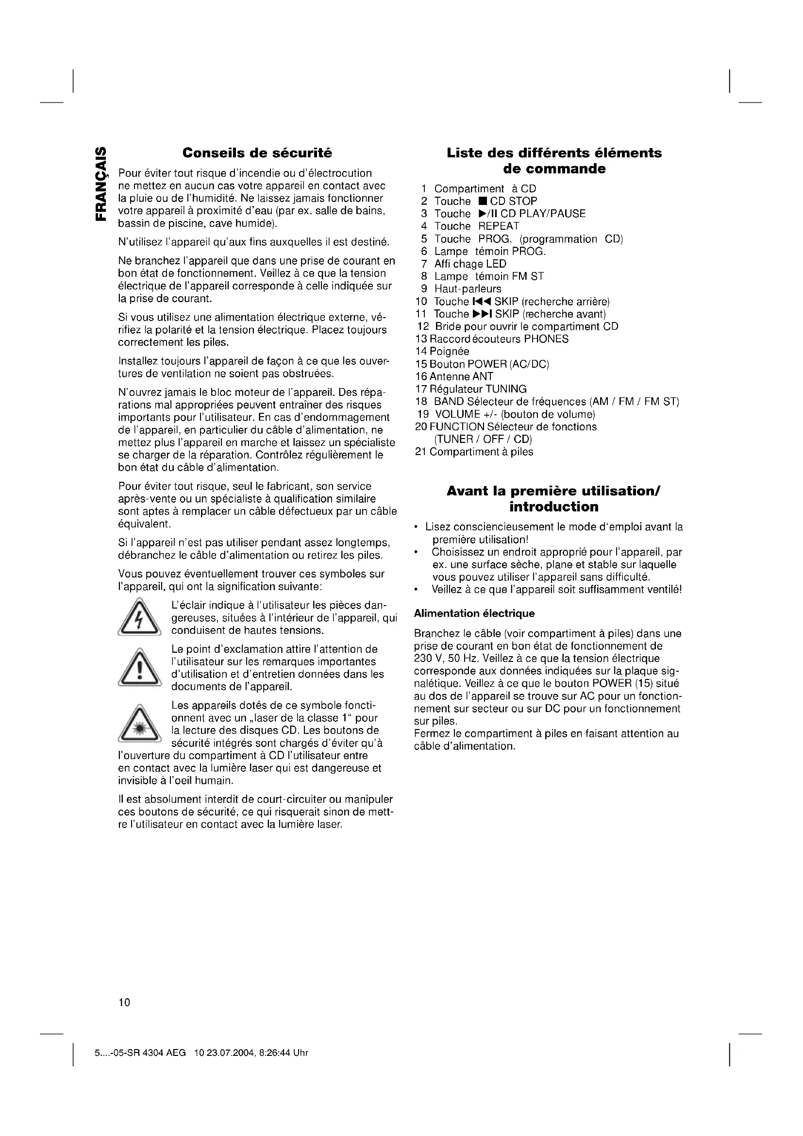 MODE D'EMPLOI SR 4304 CD AEG