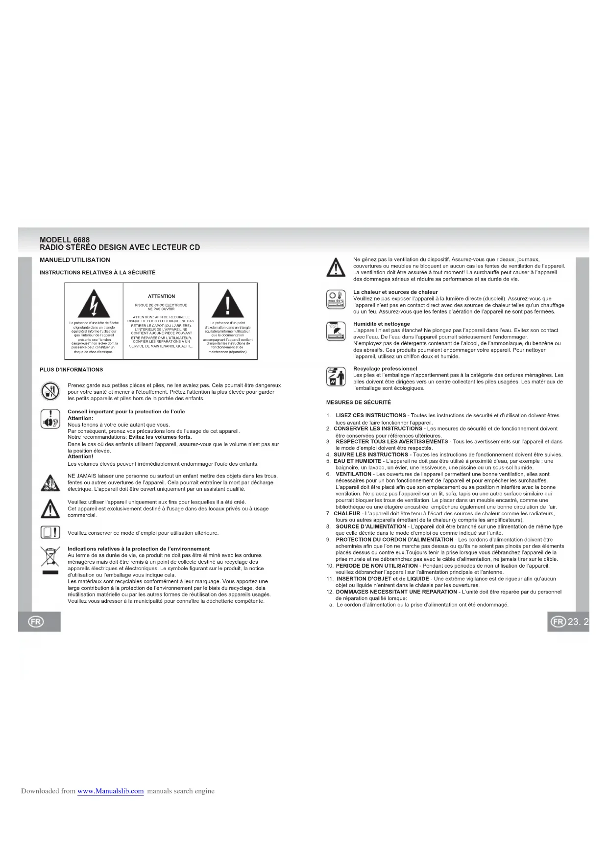 CD skips Display CD dirty or damaged. No CD inserted. CD is dirty or damaged. Condensation in laser lens. CD-R / RW is empty or not finalized. Replace or clean the disc. Insert a CD, CD-R or CD-RW. Replace or clean the CD. Wait until the laser lens is completely dry (approx. 1 hour). Finalize the CD-R/RW. Downloaded from www.Manualslib.com manuals search engine23. 22. MODELL 6688 RADIO STÉRÉO DESIGN AVEC LECTEUR CD Veuillez utiliser l'appareil uniquement aux fins pour lesquelles il a été créé.Cet appareil est exclusivement destiné à l'usage dans des locaux privés ou à usage commercial.Veuillez conserver ce mode d`emploi pour utilisation ultérieure.Indications relatives à la protection de l’environnementAu terme de sa durée de vie, ce produit ne doit pas être éliminé avec les ordures ménagères mais doit être remis à un point de collecte destiné au recyclage des appareils électriques et électroniques. Le symbole figurant sur le produit, la notice d’utilisation ou l’emballage vous indique cela.Les matériaux sont recyclables conformément à leur marquage. Vous apportez une large contribution à la protection de l’environnement par le biais du recyclage, dela réutilisation matérielle ou par les autres formes de réutilisation des appareils usagés.Veuillez vous adresser à la municipalité pour connaître la déchetterie compétente.NE JAMAIS laisser une personne ou surtout un enfant mettre des objets dans les trous, fentes ou autres ouvertures de l’appareil. Cela pourrait entraîner la mort par décharge électrique. L’appareil doit être ouvert uniquement par un assistant qualifié.Prenez garde aux petites pièces et piles, ne les avalez pas. Cela pourrait être dangereux pour votre santé et mener à l'étouffement. Prêtez l'attention la plus élevée pour garder les petits appareils et piles hors de la portée des enfants.Conseil important pour la protection de l’ouïeAttention:Nous tenons à votre ouïe autant que vous.Par conséquent, prenez vos précautions lors de l’usage de cet appareil.Notre recommandations: Evitez les volumes forts.Dans le cas où des enfants utilisent l’appareil, assurez-vous que le volume n’est pas sur la position élevée.Attention!Les volumes élevés peuvent irrémédiablement endommager l’ouïe des enfants.MANUELD’UTILISATIONINSTRUCTIONS RELATIVES À LA SÉCURITÉPLUS D’INFORMATIONSLa présence d’une tête de flèche clignotante dans un triangle équilatéral informe l’utilisateur que l’intérieur de l’appareil présente une “tension dangereuse” non isolée dont la puissance peut constituer un risque de choc électrique.La présence d’un point d’exclamation dans un triangle équilatéral informe l’utilisateur que la documentation accompagnant l’appareil contient d’importantes instructions de fonctionnement et de maintenance (réparation).ATTENTIONRISQUE DE CHOC ELECTRIQUENE PAS OUVRIRATTENTION : AFIN DE REDUIRE LE RISQUE DE CHOC ELECTRIQUE, NE PAS RETIRER LE CAPOT (OU L’ARRIERE). L’INTERIEUR DE L’APPAREIL NE CONTIENT AUCUNE PIECE POUVANT ETRE REPAREE PAR L’UTILISATEUR. CONFIER LES REPARATIONS A UN SERVICE DE MAINTENANCE QUALIFIE.MESURES DE SÉCURITÉ