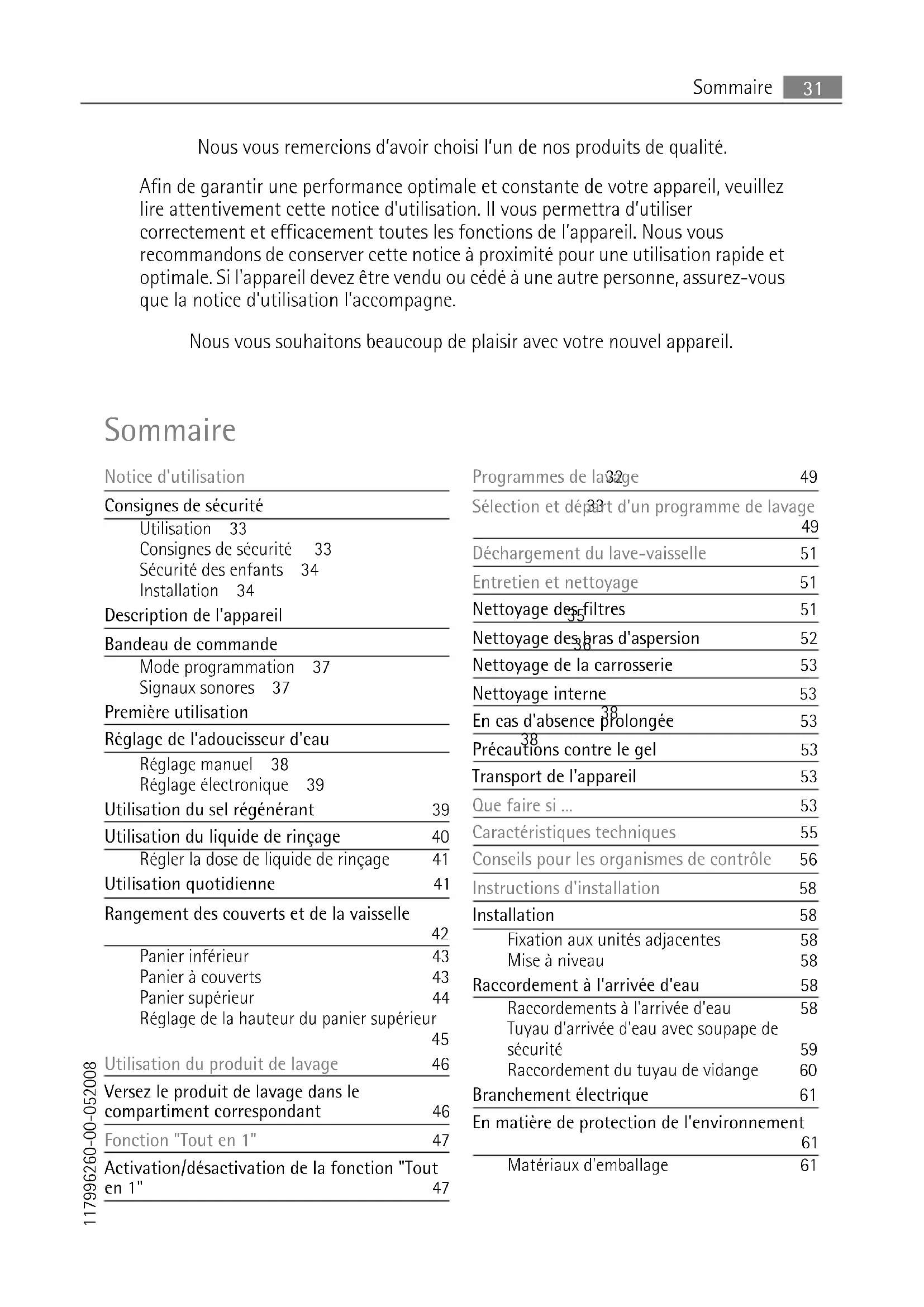 Elektrischer AnschlussNous vous remercions d’avoir choisi l’un de nos produits de qualité. Afin de garantir une performance optimale et constante de votre appareil, veuillez lire attentivement cette notice d'utilisation. Il vous permettra d’utiliser correctement et efficacement toutes les fonctions de l’appareil. Nous vous recommandons de conserver cette notice à proximité pour une utilisation rapide et optimale. Si l'appareil devez être vendu ou cédé à une autre personne, assurez-vous que la notice d'utilisation l'accompagne. Nous vous souhaitons beaucoup de plaisir avec votre nouvel appareil. Sommaire Notice d'utilisation 32 Consignes de sécurité 33 Utilisation 33 Consignes de sécurité 33 Sécurité des enfants 34 Installation 34 Description de l'appareil 35 Bandeau de commande 36 Mode programmation 37 Signaux sonores 37 Première utilisation 38 Réglage de l'adoucisseur d'eau 38 Réglage manuel 38 Réglage électronique 39 Utilisation du sel régénérant 39 Utilisation du liquide de rinçage 40 Régler la dose de liquide de rinçage 41 Utilisation quotidienne 41 Rangement des couverts et de la vaisselle