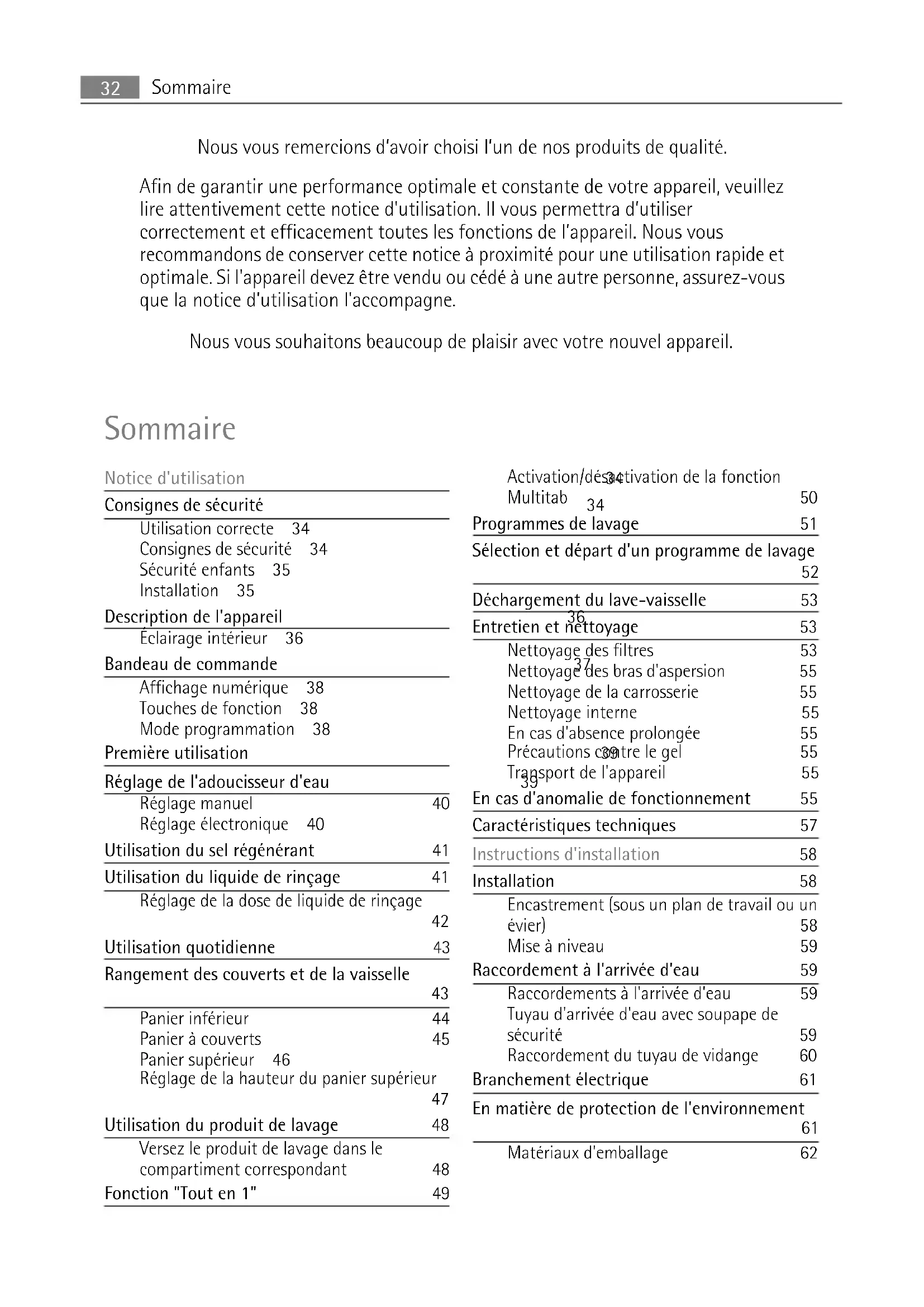 - Verwijder het slot van de deur. Zo voorkomt u dat kinderen zichzelf insluiten en hun leven in gevaar brengen. Milieubescherming 31Nous vous remercions d’avoir choisi l’un de nos produits de qualité. Afin de garantir une performance optimale et constante de votre appareil, veuillez lire attentivement cette notice d'utilisation. Il vous permettra d’utiliser correctement et efficacement toutes les fonctions de l’appareil. Nous vous recommandons de conserver cette notice à proximité pour une utilisation rapide et optimale. Si l'appareil devez être vendu ou cédé à une autre personne, assurez-vous que la notice d'utilisation l'accompagne. Nous vous souhaitons beaucoup de plaisir avec votre nouvel appareil. Sommaire Notice d'utilisation 34 Consignes de sécurité 34 Utilisation correcte 34 Consignes de sécurité 34 Sécurité enfants 35 Installation 35 Description de l'appareil 36 Éclairage intérieur 36 Bandeau de commande 37 Affichage numérique 38 Touches de fonction 38 Mode programmation 38 Première utilisation 39 Réglage de l'adoucisseur d'eau 39 Réglage manuel 40 Réglage électronique 40 Utilisation du sel régénérant 41 Utilisation du liquide de rinçage 41 Réglage de la dose de liquide de rinçage