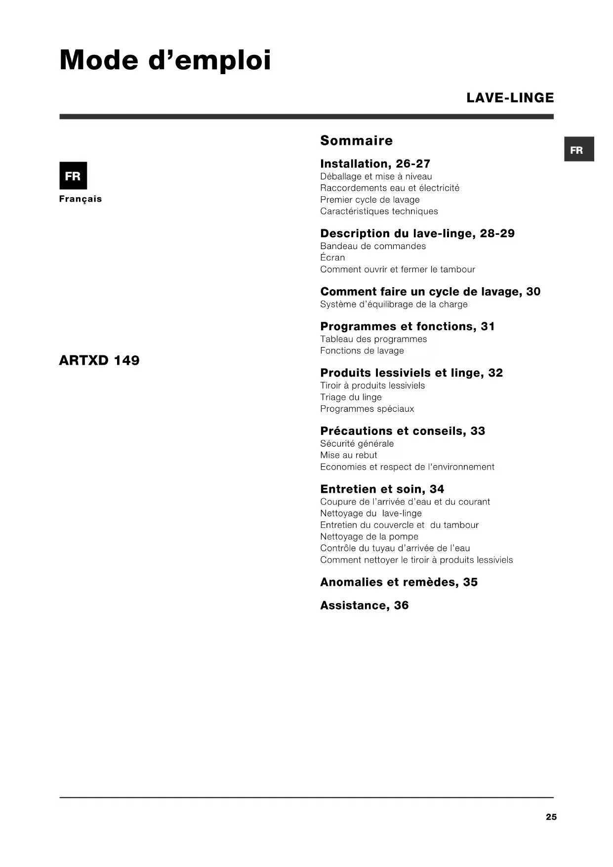 Français Sommaire Installation, 26-27 Déballage et mise à niveau Raccordements eau et électricité Premier cycle de lavage Caractéristiques techniques Description du lave-linge, 28-29 Bandeau de commandes Écran Comment ouvrir et fermer le tambour Comment faire un cycle de lavage, 30 Système déquilibrage de la charge Programmes et fonctions, 31 Tableau des programmes Fonctions de lavage Produits lessiviels et linge, 32 Tiroir à produits lessiviels Triage du linge Programmes spéciaux Précautions et conseils, 33 Sécurité générale Mise au rebut Economies et respect de l'environnement Entretien et soin, 34 Coupure de larrivée deau et du courant Nettoyage du lave-linge Entretien du couvercle et du tambour Nettoyage de la pompe Contrôle du tuyau darrivée de leau Comment nettoyer le tiroir à produits lessiviels Anomalies et remèdes, 35 Assistance, 36
