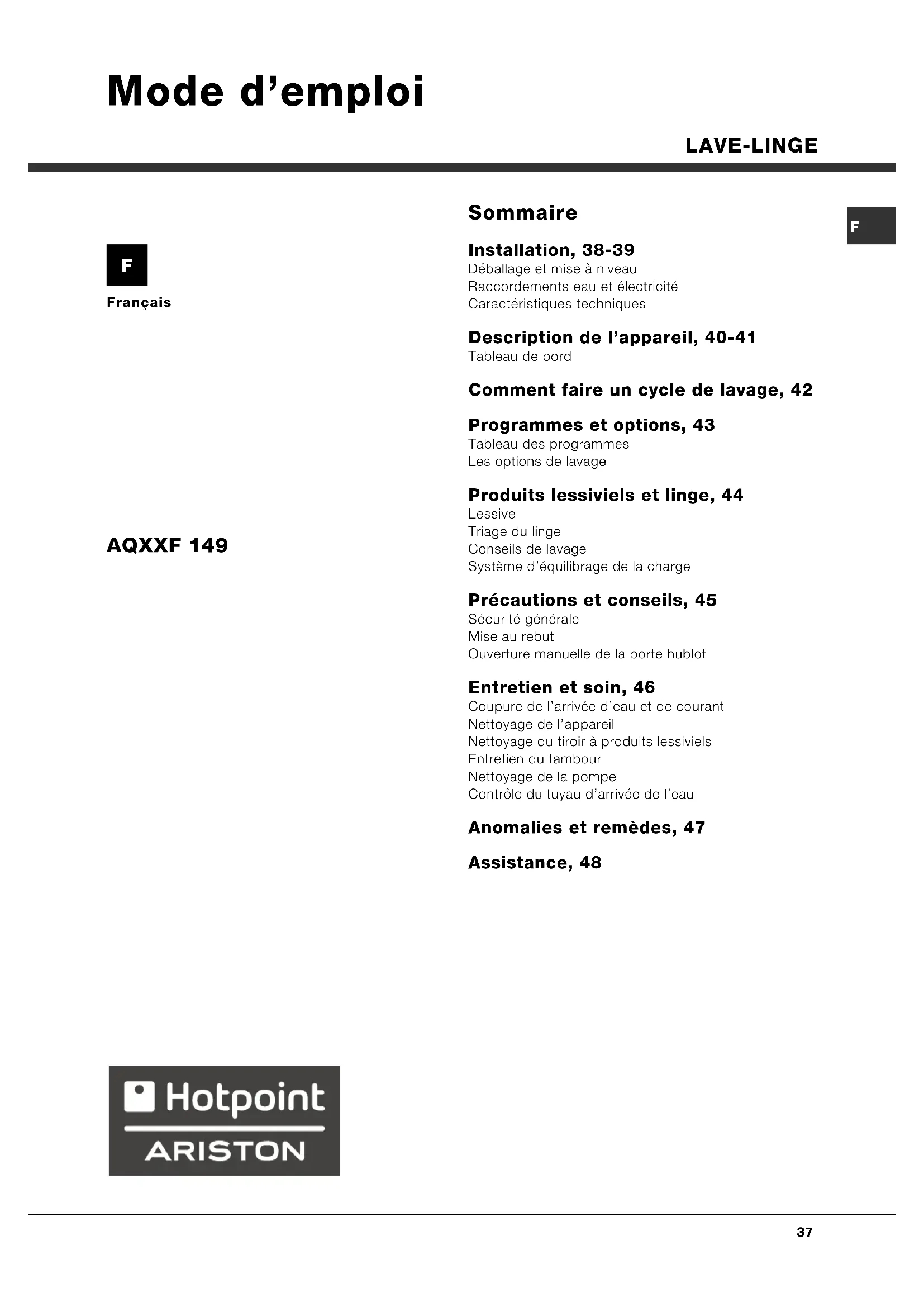 AQXXF 149 - Machine à laver HOTPOINT ARISTON - Notice d'utilisation et mode d'emploi gratuit