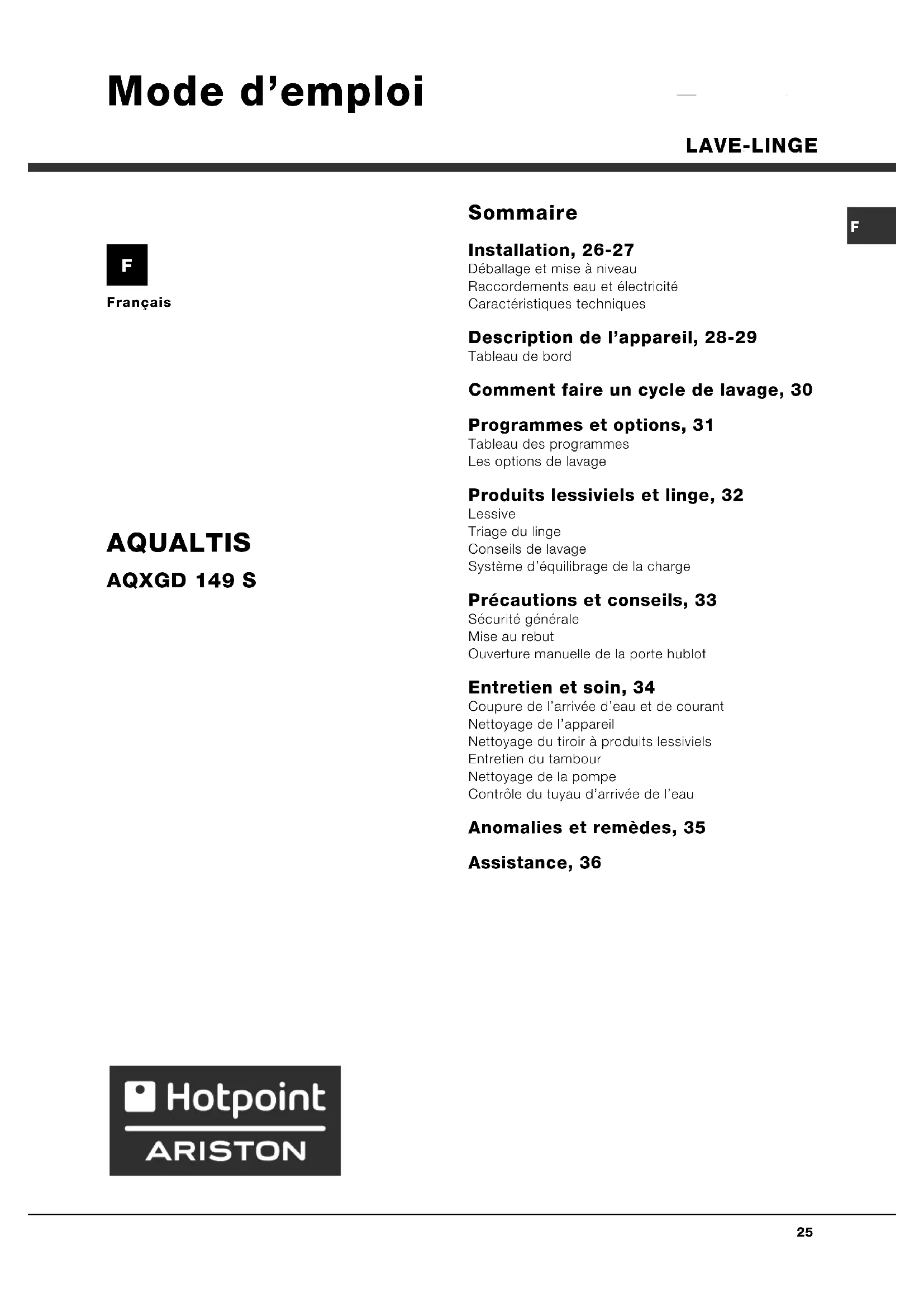 Français Sommaire Installation, 26-27 Déballage et mise à niveauRaccordements eau et électricitéCaractéristiques techniques Description de lappareil, 28-29 Tableau de bord Comment faire un cycle de lavage, 30 Programmes et options, 31 Tableau des programmesLes options de lavage Produits lessiviels et linge, 32 LessiveTriage du lingeConseils de lavageSystème déquilibrage de la charge Précautions et conseils, 33 Sécurité généraleMise au rebutOuverture manuelle de la porte hublot Entretien et soin, 34 Coupure de larrivée deau et de courantNettoyage de lappareilNettoyage du tiroir à produits lessivielsEntretien du tambourNettoyage de la pompeContrôle du tuyau darrivée de leau Anomalies et remèdes, 35 Assistance, 36