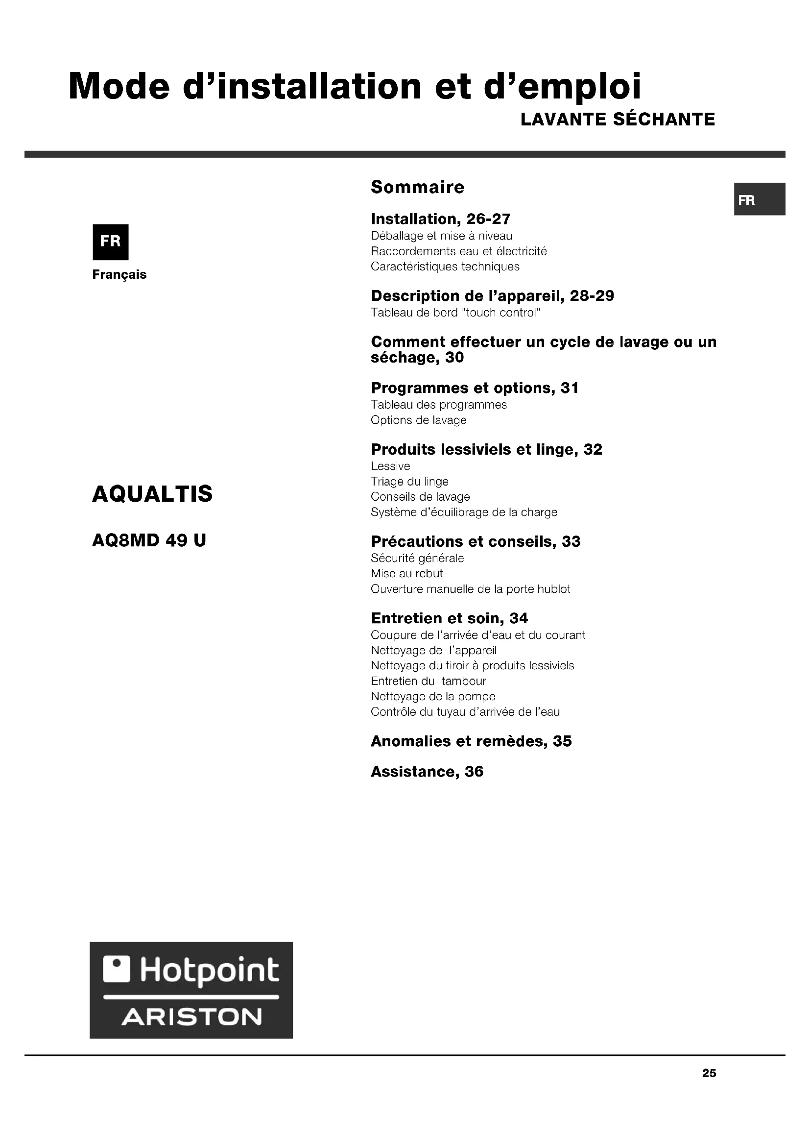 Français Sommaire Installation, 26-27 Déballage et mise à niveauRaccordements eau et électricitéCaractéristiques techniques Description de lappareil, 28-29 Tableau de bord "touch control" Comment effectuer un cycle de lavage ou un séchage, 30 Programmes et options, 31 Tableau des programmesOptions de lavage Produits lessiviels et linge, 32 LessiveTriage du lingeConseils de lavageSystème déquilibrage de la charge Précautions et conseils, 33 Sécurité généraleMise au rebutOuverture manuelle de la porte hublot Entretien et soin, 34 Coupure de larrivée deau et du courantNettoyage de lappareilNettoyage du tiroir à produits lessivielsEntretien du tambourNettoyage de la pompeContrôle du tuyau darrivée de leau Anomalies et remèdes, 35 Assistance, 36