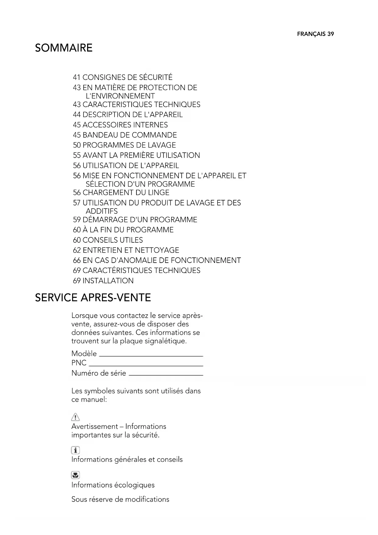 - Direct op een ingebouwde afvoer- pomp in de kamerwand en zet vast met een klem. U kunt de afvoerslang maximaal 400 mm verlengen. Neem con- tact op met de klantenservice voor de andere afvoerslang en de verlenging. 38SERVICE APRES-VENTE Lorsque vous contactez le service après- vente, assurez-vous de disposer des données suivantes. Ces informations se trouvent sur la plaque signalétique. Modèle PNC Numéro de série Les symboles suivants sont utilisés dans ce manuel: Avertissement – Informations importantes sur la sécurité. Informations générales et conseils Informations écologiques Sous réserve de modifications SOMMAIRE