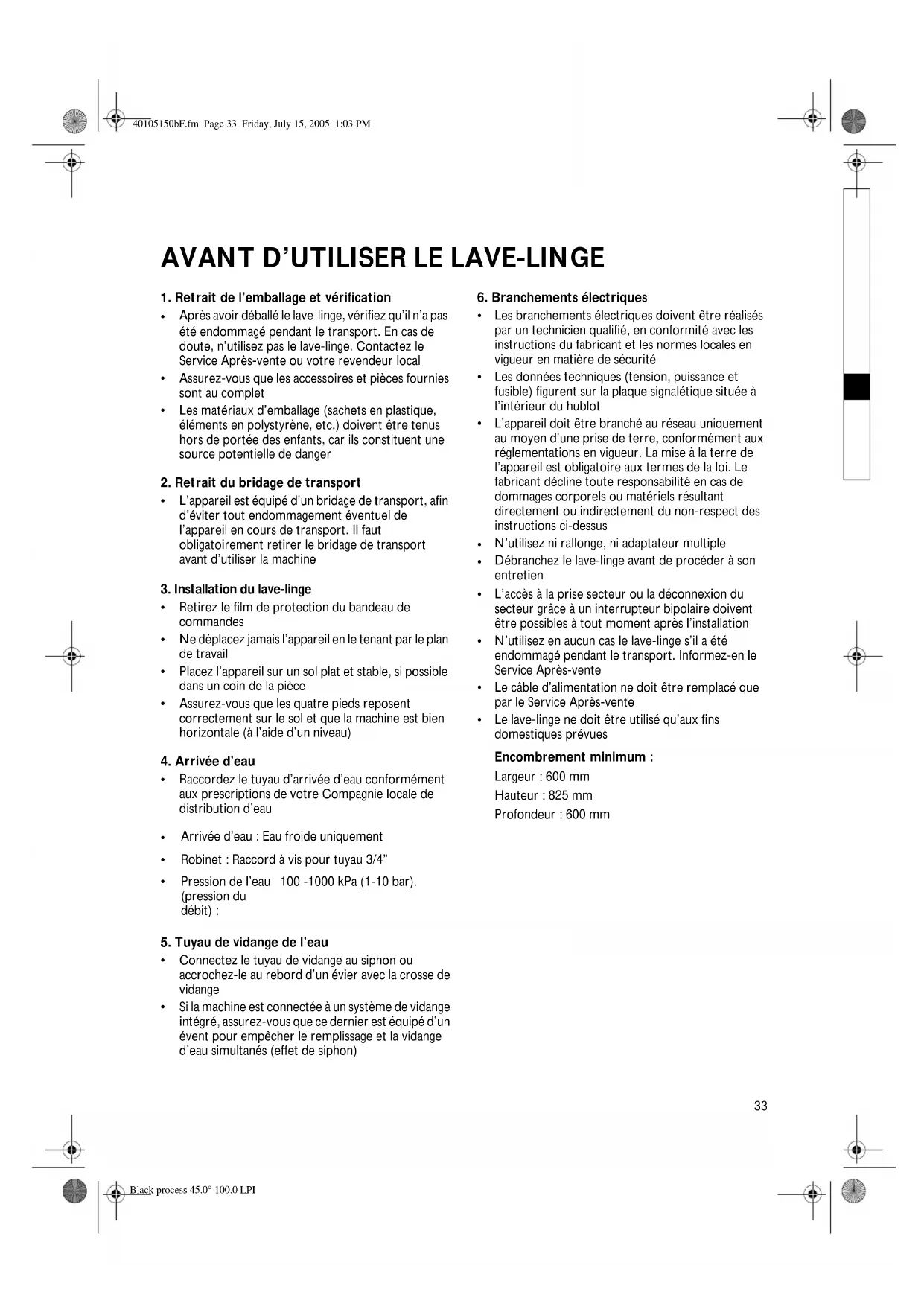 Pression de l’eau (pression du débit) : 100 -1000 kPa (1-10 bar). 40105150bF.fm Page 33 Friday, July 15, 2005 1:03 PM Red spot 45.0° 100.0 LPI• Arrivée d’eau : Eau froide uniquement