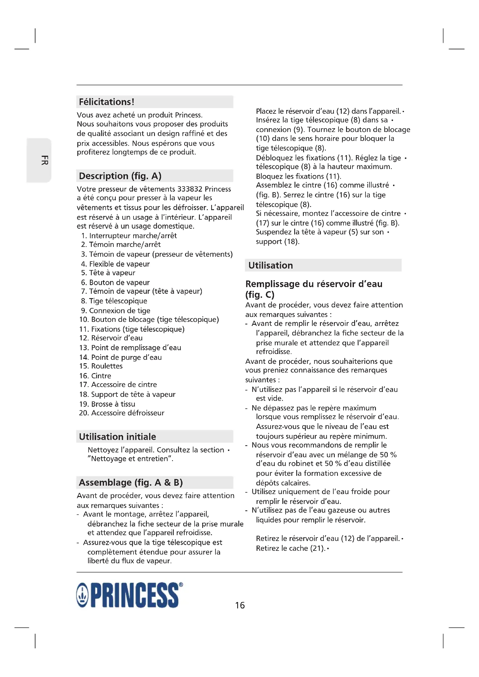 Félicitations! Vous avez acheté un produit Princess. Nous souhaitons vous proposer des produits de qualité associant un design raffiné et des prix accessibles. Nous espérons que vous profiterez longtemps de ce produit. Description (fig. A) Votre presseur de vêtements 333832 Princess a été conçu pour presser à la vapeur les vêtements et tissus pour les défroisser. L’appareil est réservé à un usage à l’intérieur. L’appareil est réservé à un usage domestique.