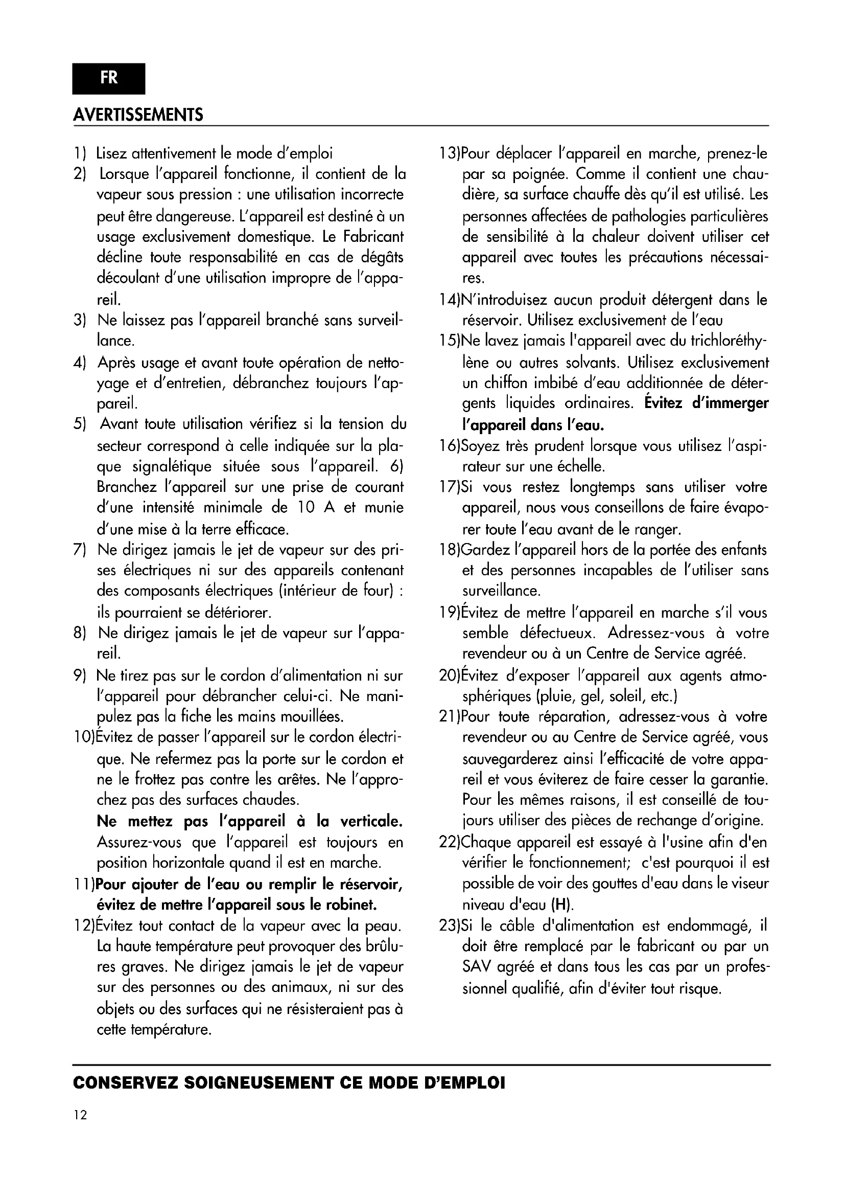 l’appareil pour débrancher celui-ci. Ne mani- pulez pas la fiche les mains mouillées. 10)Évitez de passer l’appareil sur le cordon électri- que. Ne refermez pas la porte sur le cordon et ne le frottez pas contre les arêtes. Ne l’appro- chez pas des surfaces chaudes. Ne mettez pas l’appareil à la verticale. Assurez-vous que l’appareil est toujours en position horizontale quand il est en marche. 11)Pour ajouter de l’eau ou remplir le réservoir, évitez de mettre l’appareil sous le robinet. 12)Évitez tout contact de la vapeur avec la peau. La haute température peut provoquer des brûlu- res graves. Ne dirigez jamais le jet de vapeur sur des personnes ou des animaux, ni sur des objets ou des surfaces qui ne résisteraient pas à cette température. 13)Pour déplacer l’appareil en marche, prenez-le par sa poignée. Comme il contient une chau- dière, sa surface chauffe dès qu’il est utilisé. Les personnes affectées de pathologies particulières de sensibilité à la chaleur doivent utiliser cet appareil avec toutes les précautions nécessai- res. 14)N’introduisez aucun produit détergent dans le réservoir. Utilisez exclusivement de l’eau 15)Ne lavez jamais l'appareil avec du trichloréthy- lène ou autres solvants. Utilisez exclusivement un chiffon imbibé d’eau additionnée de déter- gents liquides ordinaires. Évitez d’immerger l’appareil dans l’eau. 16)Soyez très prudent lorsque vous utilisez l’aspi- rateur sur une échelle. 17)Si vous restez longtemps sans utiliser votre appareil, nous vous conseillons de faire évapo- rer toute l’eau avant de le ranger. 18)Gardez l’appareil hors de la portée des enfants et des personnes incapables de l’utiliser sans surveillance. 19)Évitez de mettre l’appareil en marche s’il vous semble défectueux. Adressez-vous à votre revendeur ou à un Centre de Service agréé. 20)Évitez d’exposer l’appareil aux agents atmo- sphériques (pluie, gel, soleil, etc.) 21)Pour toute réparation, adressez-vous à votre revendeur ou au Centre de Service agréé, vous sauvegarderez ainsi l’efficacité de votre appa- reil et vous éviterez de faire cesser la garantie. Pour les mêmes raisons, il est conseillé de tou- jours utiliser des pièces de rechange d’origine. 22)Chaque appareil est essayé à l'usine afin d'en vérifier le fonctionnement; c'est pourquoi il est possible de voir des gouttes d'eau dans le viseur niveau d'eau (H). 23)Si le câble d'alimentation est endommagé, il doit être remplacé par le fabricant ou par un SAV agréé et dans tous les cas par un profes- sionnel qualifié, afin d'éviter tout risque.
