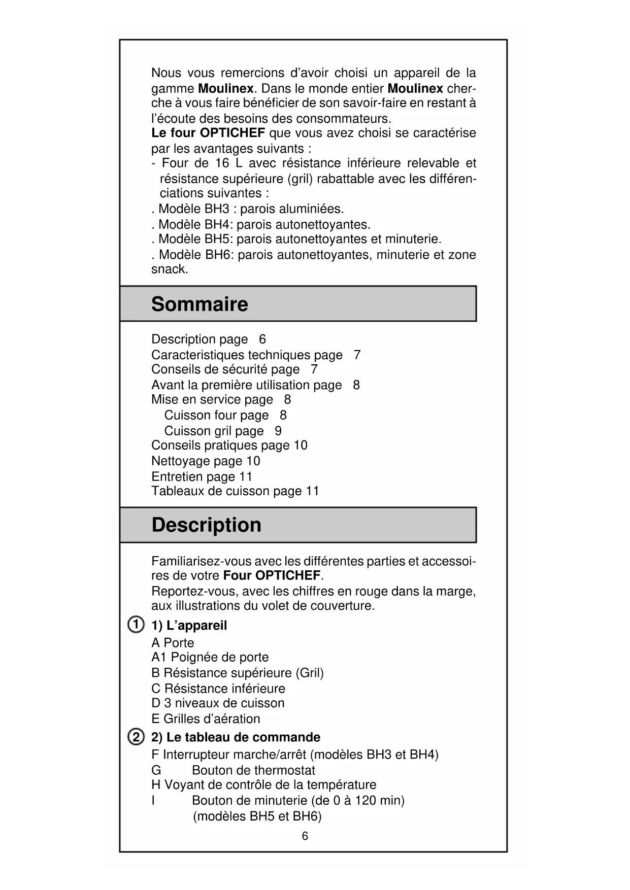 Nous vous remercions d’avoir choisi un appareil de la gamme Moulinex. Dans le monde entier Moulinex cher- che à vous faire bénéficier de son savoir-faire en restant à l’écoute des besoins des consommateurs. Le four OPTICHEF que vous avez choisi se caractérise par les avantages suivants : - Four de 16 L avec résistance inférieure relevable et résistance supérieure (gril) rabattable avec les différen- ciations suivantes : . Modèle BH3 : parois aluminiées... Modèle BH4: parois autonettoyantes... Modèle BH5: parois autonettoyantes et minuterie... Modèle BH6: parois autonettoyantes, minuterie et zone snack. Sommaire Description page 6 Caracteristiques techniques page 7 Conseils de sécurité page 7 Avant la première utilisation page 8 Mise en service page 8 Cuisson four page 8 Cuisson gril page 9 Conseils pratiques page 10 Nettoyage page 10 Entretien page 11 Tableaux de cuisson page 11 Description Familiarisez-vous avec les différentes parties et accessoi- res de votre Four OPTICHEF. Reportez-vous, avec les chiffres en rouge dans la marge, aux illustrations du volet de couverture.