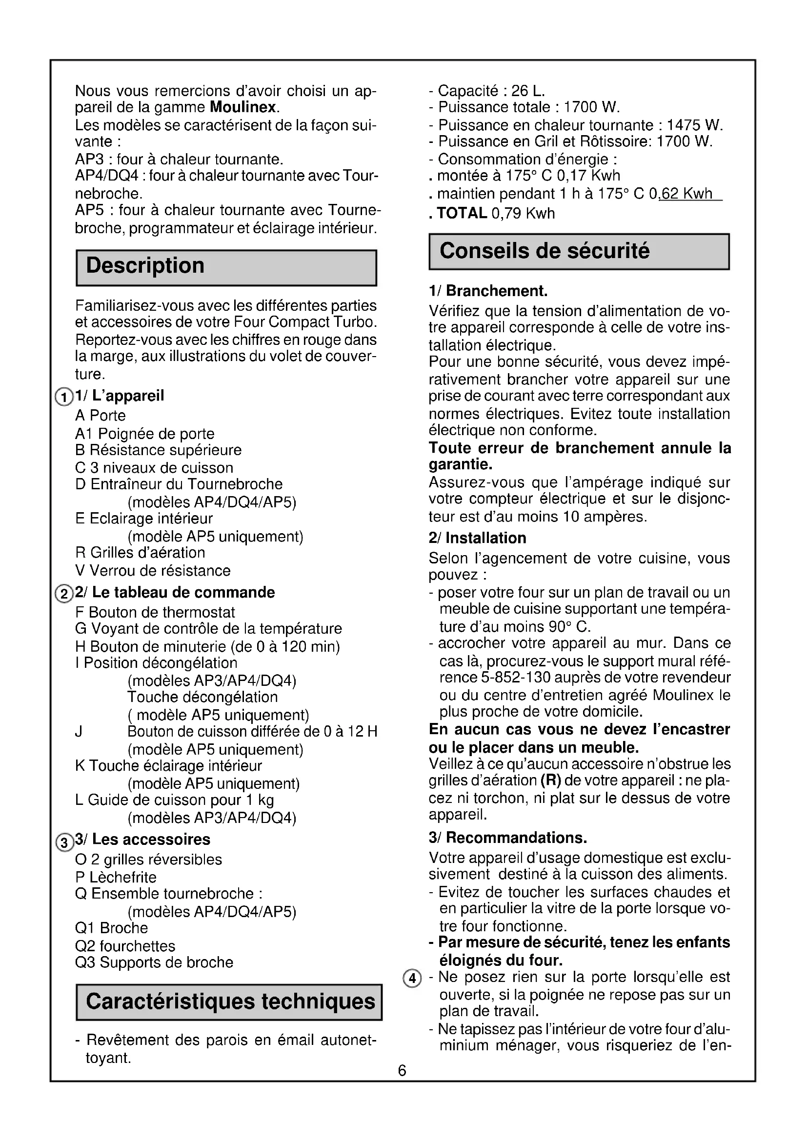 Bouton de cuisson différée de 0 à 12 H (modèle AP5 uniquement) K Touche éclairage intérieur (modèle AP5 uniquement) L Guide de cuisson pour 1 kg (modèles AP3/AP4/DQ4) 3/ Les accessoires O 2 grilles réversibles P Lèchefrite Q Ensemble tournebroche : (modèles AP4/DQ4/AP5) Q1 Broche Q2 fourchettes Q3 Supports de broche Caractéristiques techniques - Revêtement des parois en émail autonet- toyant. - Capacité : 26 L. - Puissance totale : 1700 W. - Puissance en chaleur tournante : 1475 W. - Puissance en Gril et Rôtissoire: 1700 W. - Consommation d’énergie : . montée à 175° C 0,17 Kwh . maintien pendant 1 h à 175° C 0,62 Kwh . TOTAL 0,79 Kwh Conseils de sécurité 1/ Branchement. Vérifiez que la tension d’alimentation de vo- tre appareil corresponde à celle de votre ins- tallation électrique. Pour une bonne sécurité, vous devez impé- rativement brancher votre appareil sur une prise de courant avec terre correspondant aux normes électriques. Evitez toute installation électrique non conforme. Toute erreur de branchement annule la garantie. Assurez-vous que l’ampérage indiqué sur votre compteur électrique et sur le disjonc- teur est d’au moins 10 ampères. 2/ Installation Selon l’agencement de votre cuisine, vous pouvez : - poser votre four sur un plan de travail ou un meuble de cuisine supportant une tempéra- ture d’au moins 90° C. - accrocher votre appareil au mur. Dans ce cas là, procurez-vous le support mural réfé- rence 5-852-130 auprès de votre revendeur ou du centre d’entretien agréé Moulinex le plus proche de votre domicile. En aucun cas vous ne devez l’encastrer ou le placer dans un meuble. Veillez à ce qu’aucun accessoire n’obstrue les grilles d’aération (R) de votre appareil : ne pla- cez ni torchon, ni plat sur le dessus de votre appareil. 3/ Recommandations. Votre appareil d’usage domestique est exclu- sivement destiné à la cuisson des aliments. - Evitez de toucher les surfaces chaudes et en particulier la vitre de la porte lorsque vo- tre four fonctionne. - Par mesure de sécurité, tenez les enfants éloignés du four. - Ne posez rien sur la porte lorsqu’elle est ouverte, si la poignée ne repose pas sur un plan de travail. - Ne tapissez pas l’intérieur de votre four d’alu- minium ménager, vous risqueriez de l’en-