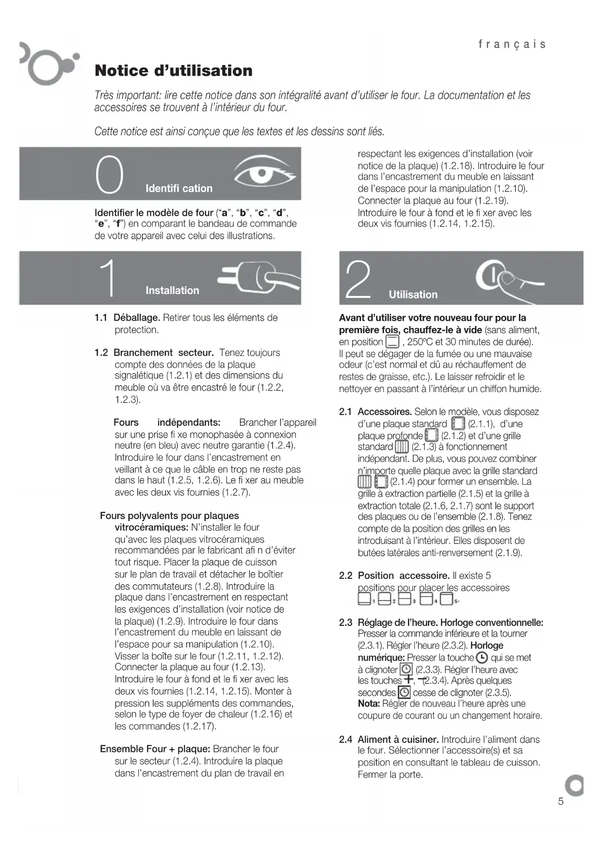 Notice d’utilisation Très important: lire cette notice dans son intégralité avant d’utiliser le four. La documentation et les accessoires se trouvent à l’intérieur du four. Cette notice est ainsi conçue que les textes et les dessins sont liés.