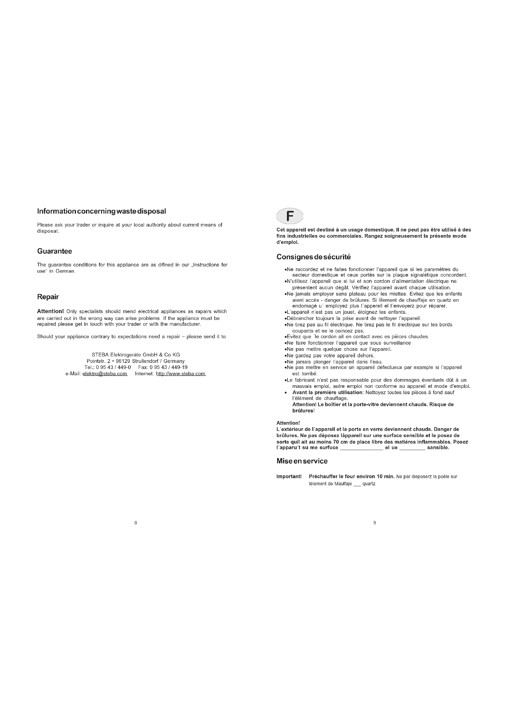 - Avant la première utilisation: Nettoyez toutes les pièces à fond sauf l’élément de chauffage. Attention! Le boîtier et la porte-vitre deviennent chauds. Risque de brûlures! Attention! L´extérieur de l´appareil et la porte en verre deviennent chauds. Danger de brûlures. Ne pas déposez láppareil sur une surface sensible et le posez de sorte quíl ait au moins 70 cm de place libre des matiéres inflammables. Posez l´apparu´t su me surfuce _______________ el ue _________ sansible. Mise en service Important! Préchauffer le four environ 10 min. Ne par dieposerz la poéle sur lélement de Maulfaje ___ quartz Information concerning waste disposal Please ask your trader or inquire at your local authority about current means of disposal. Guarantee The guarantee conditions for this appliance are as difined in our „Instructions for use“ in German. Repair Attention! Only specialists should mend electrical appliances as rapairs which are carried out in the wrong way can arise problems. If the appliance must be repaired please get in touch with your trader or with the manufacturer. Should your appliance contrary to expectations need a repair – please send it to: STEBA Elektrogeräte GmbH & Co KG Pointstr. 2 • 96129 Strullendorf / Germany Tel.: 0 95 43 / 449-0 Fax: 0 95 43 / 449-19 e-Mail: elektro@steba.com Internet: http://www.steba.com1110 Mise au rebut Pour connaître les points de collecte des appareils usagés, renseignez-vous svp auprès de votre revendeur ou de votre mairie. Garantie Les conditions de garantie applicables sont celles publiées dans le mode d´emploi allemand. Conseil en cas de panne Attention! Les appareils eléctriques ne peuvent être réparés que par un électricien, étant donné qu‘une fausse manipulation peut entrîner des dégats irreparables. En cas de probleèmes, venillez vous adresser à un spécialiste on directement à : STEBA Elektrogeräte GmbH & Co KG Pointstr. 2 • 96129 Strullendorf / Germany Tel.: 0 95 43 / 449-0 Fax: 0 95 43 / 449-19 e-Mail: elektro@steba.com Internet: http://www.steba.com
