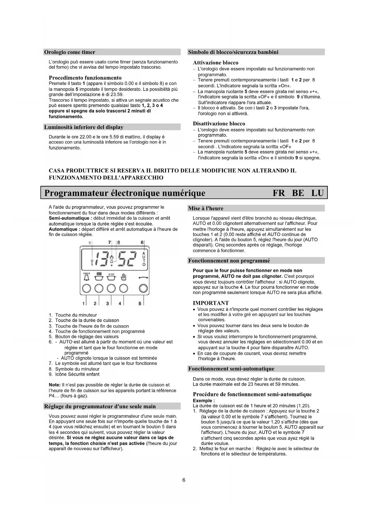 touche 4 pour faire disparaître AUTO. Quand AUTO n'est plus affiché, le four est prêt à fonctionner en mode non programmé. Utilisation du programmateur en tant que minuteur Le programmateur peut être utilisée en tant que minuteur indépendamment du fonctionnement du four ; il vous avertit par un signal sonore que la durée réglée s'est écoulée. Procédure de fonctionnement Appuyez sur la touche 1 (0.00 et le symbole 8 apparaissent sur l'afficheur). A l’aide du bouton 5, réglez la durée au bout de laquelle vous voulez être averti. La durée maximale est de 23 heures et 59 minutes. Le signal sonore intermittent retentit et vous pouvez l'interrompre en appuyant sur n'importe quelle touche 1, 2, 3 ou 4 ou bien il s'arrêtera de lui-même au bout de 2 minutes. Intensité lumineuse réduite Entre 22 h 00 et 5 h 59, l'intensité lumineuse de l'afficheur est automatiquement réduite si le programmateur n'est pas en service pendant ce temps-là. Sécurité enfants Activation de la sécurité enfants − Le programmateur doit être réglé sur le mode manuel. − Appuyez en même temps sur les touches 1 et 2 pendant 8 secondes. « ON » apparaît sur l’afficheur. − Tournez le bouton 5 dans le sens « valeurs croissantes » (+) ; « OF » apparaît sur l’afficheur et l’icône 9 s’allume. À ce moment-la, l’afficheur indique l’heure du jour. − Maintenant, la sécurité enfants est active. Si vous essayez de régler la durée ou l’heure de fin de cuisson avec les touches 2 ou 3, elles seront inopérantes et l’heure du jour restera affichée. Désactivation de la sécurité enfants − Le programmateur doit être réglé sur le mode manuel. − Appuyez en même temps sur les touches 1 et 2 pendant 8 secondes. « OF » apparaît sur l’afficheur. − Tournez le bouton 5 dans le sens « valeurs croissantes » (+) ; « ON » apparaît sur l’afficheur et l’icône 9 s’éteint. NOUS NOUS RESERVONS LE DROIT DE PROCEDER A DES MODIFICATIONS QUI N’ONT PAS D’INCIDENCE SUR LE FONCTIONNEMENT DE L’APPAREIL.8 Reloj electrónico digital ES Con el reloj de programación puede programar el funcionamiento del horno de los dos modos siguientes: Semiautomático: la puesta en marcha inmediata del horno y la desconexión automática después de un tiempo determinado. Automático: después de un tiempo determinado la puesta en marcha y la desconexión automáticas