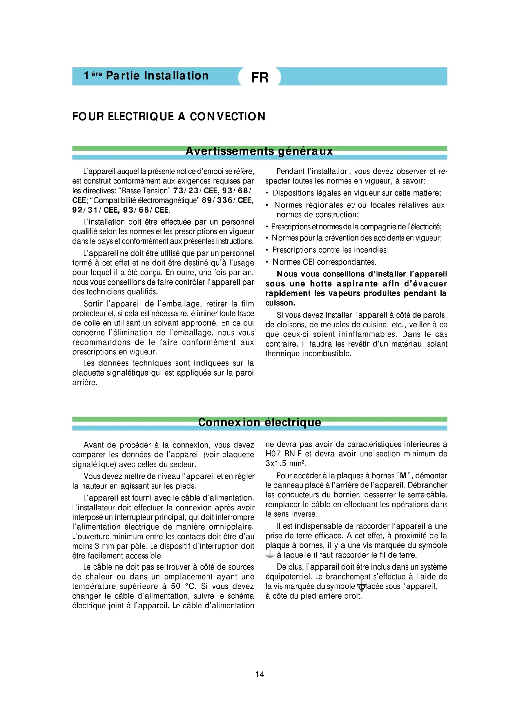 Avertissements généraux Connexion électrique L’appareil auquel la présente notice d’empoi se réfère, est construit conformément aux exigences requises par les directives: ”Basse Tension” 73/23/CEE, 93/68/ CEE; “Compatibilité électromagnétique” 89/336/CEE, 92/31/CEE, 93/68/CEE. L’installation doit être effectuée par un personnel qualifié selon les normes et les prescriptions en vigueur dans le pays et conformément aux présentes instructions. L’appareil ne doit être utilisé que par un personnel formé à cet effet et ne doit être destiné qu’à l’usage pour lequel il a été conçu. En outre, une fois par an, nous vous conseillons de faire contrôler l'appareil par des techniciens qualifiés. Sortir l’appareil de l’emballage, retirer le film protecteur et, si cela est nécessaire, éliminer toute trace de colle en utilisant un solvant approprié. En ce qui concerne l’élimination de l’emballage, nous vous recommandons de le faire conformément aux prescriptions en vigueur. Les données techniques sont indiquées sur la plaquette signalétique qui est appliquée sur la paroi arrière. Avant de procéder à la connexion, vous devez comparer les données de l’appareil (voir plaquette signalétique) avec celles du secteur. Vous devez mettre de niveau l’appareil et en régler la hauteur en agissant sur les pieds. L’appareil est fourni avec le câble d’alimentation. L’installateur doit effectuer la connexion après avoir interposé un interrupteur principal, qui doit interrompre l’alimentation électrique de manière omnipolaire. L’ouverture minimum entre les contacts doit être d’au moins 3 mm par pôle. Le dispositif d’interruption doit être facilement accessible. Le câble ne doit pas se trouver à côté de sources de chaleur ou dans un emplacement ayant une température supérieure à 50 °C. Si vous devez changer le câble d’alimentation, suivre le schéma électrique joint à l’appareil. Le câble d’alimentation Pendant l’installation, vous devez observer et re- specter toutes les normes en vigueur, à savoir: