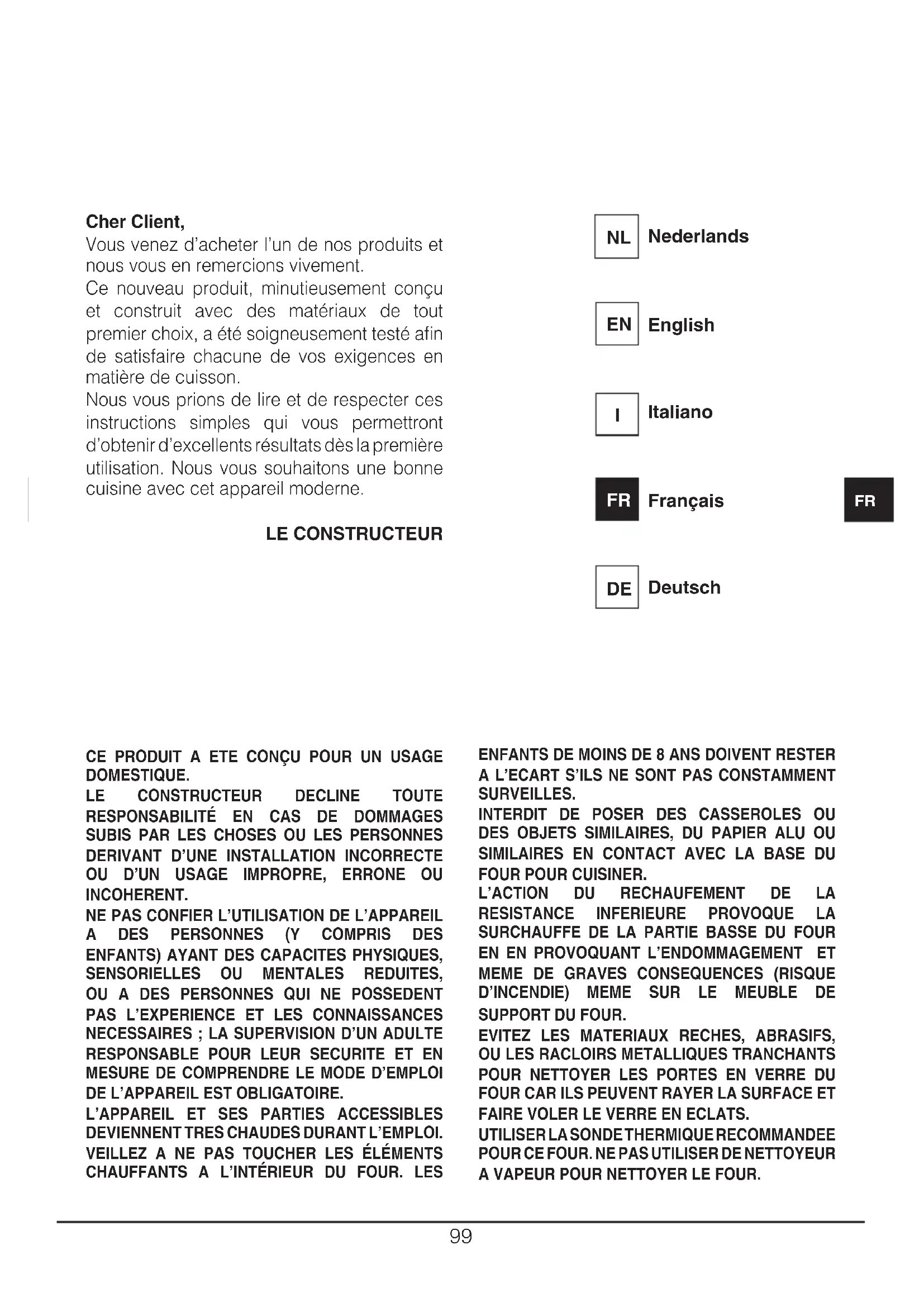 Cher Client, Vous venez d’acheter l’un de nos produits et nous vous en remercions vivement. Ce nouveau produit, minutieusement conçu et construit avec des matériaux de tout premier choix, a été soigneusement testé afin de satisfaire chacune de vos exigences en matière de cuisson. Nous vous prions de lire et de respecter ces instructions simples qui vous permettront d’obtenir d’excellents résultats dès la première utilisation. Nous vous souhaitons une bonne cuisine avec cet appareil moderne. LE CONSTRUCTEUR CE PRODUIT A ETE CONÇU POUR UN USAGE DOMESTIQUE.