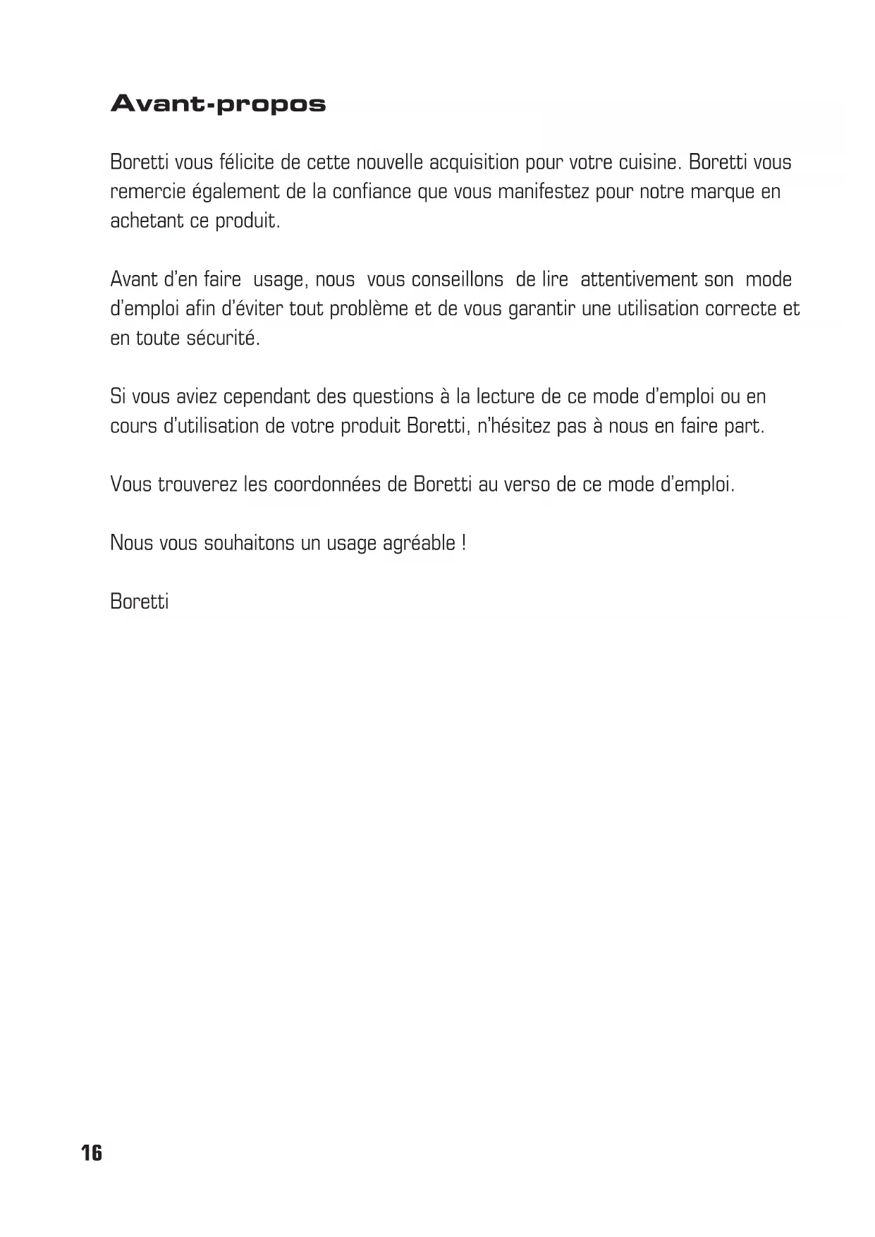 Rassemblez toujours les restes d’emballage afi n qu’ils ne s’éparpillent pas. Triez les différents matériaux d’emballage et les déposer auprès du centre de traitement des déchets le plus pro- che. Pour emballer nos produits, nous utilisons des matériaux non polluants, recyclables et donc préservant l’environnement. Nous vous deman- dons donc de veiller à un traitement approprié des matériaux d’emballage. Les coordonnées des centres de collecte, recyclage et traitement des déchets sont disponibles auprès de votre dépositaire ou des institutions locales concer- nées. Ne jamais jeter l’emballage ou des déchets d’emballage n’importe où. Les enfants risquent en effet, par exemple, de s’étouffer comme pour les sacs en plastique. Vous devez également veiller à une évacuation et un traitement appropriés de votre ancienne cuisinière. Important: déposez votre ancien appareil auprès de l’entreprise locale autorisée à la collecte des appareils mé- nagers. Un traitement correct permet de recycler des maté- riaux d’une manière respon- sable. Avant d’évacuer votre appareil usagé, veillez à démonter les portes et laisser les plaques dans la position d’utilisation afi n d’éviter que des enfants ne se trouvent ac- cidentellement bloqués à l’intérieur du four. Cou- per également le câble d’alimentation électrique et le retirer. Ladirective détermine les normes applicables à la collecte et au recyclage des ap- pareils en vigueur sur tout le territoire de l’Union Européenne. Dispositions concernant l’environnement30 Vorwort Herzlichen Glückwunsch! Jetzt nennen Sie offi ziell einen Boretti Ihr Eigen. In den kommenden Jahren werden Sie entdecken, dass ein Boretti das Kochen zu einem wahren Fest werden lässt. Bei der Entwicklung Ihres Einbaugeräts haben wir alles getan, damit Sie als Koch im Mittelpunkt stehen. Deshalb halten Sie auch keine Anleitung im Format eines Telefonbuchs in den Händen, sondern ein handliches, sehr gut lesbares Exemplar. Genau so ist auch Ihr Einbaugerät, das heißt: verständlich und übersichtlich. Wir empfehlen Ihnen, vor Inbetriebnahme Ihres Einbaugeräts diese Anleitung auf- merksam durchzulesen, damit es nicht zu Problemen kommt. Falls nach dem Lesen der Anleitung oder im Einsatz noch Fragen zum Produkt auftauchen, dann hören wir Ihre Fragen gern von Ihnen. Wir wünschen Ihnen viel Spaß beim Kochen! BorettiNL