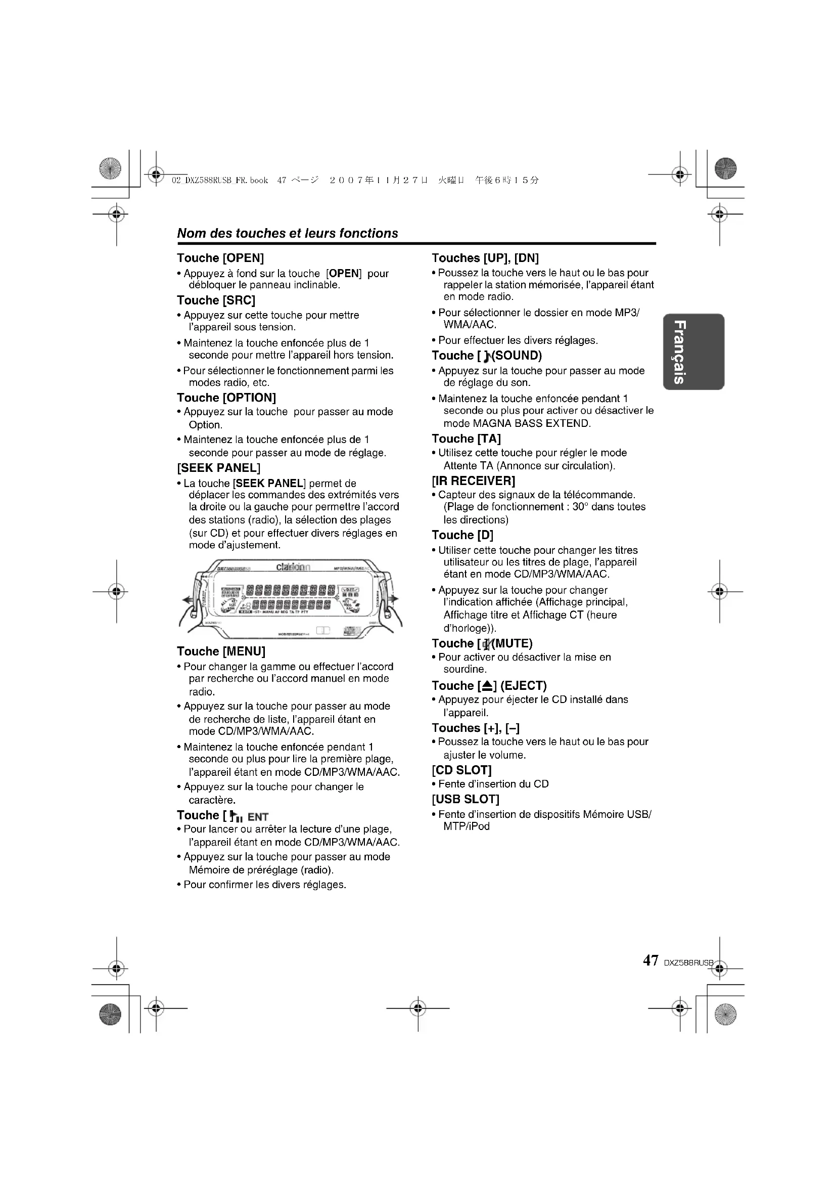 Voyant Restaurateur de son : Voyant BluetoothST : Voyant Stéréo (radio seulement)MANU : Voyant ManuelAF : Voyant Fréquence alternativeREG : Voyant Émission régionaleTA : Voyant Annonce sur circulationTP : Voyant Programme sur circulationPTY : Voyant Type de Programme : Voyant No. de disque Indication de canal préréglé (1 à 6) : Voyant MAGNA BASS EX : Indication de Disque ou de Dossier : Voyant Lecture aléatoire : Voyant Lecture répétée : Voyant Lecture à exploration : Voyant Saisie : Voyant Sourdine ALL : Indication de la Source Affichage de : CD, USB, etc. Indication d’état de fonctionnement Affichage de : Source, Titres, Fonction, Réglage, Horloge, etc. Indication d’état de fonctionnement Affichage de : Titres, Fréquence, Gamme, Canal, Durée de lecture, etc. 02_DXZ588RUSB_FR.book 48 ページ 2007年11月27日 火曜日 午後6時15分49 DXZ588RUSB Français