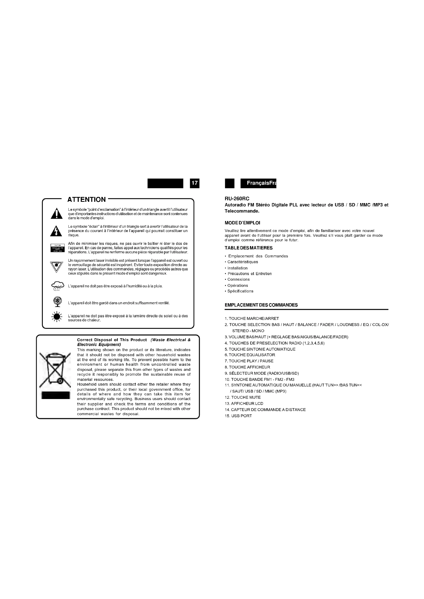 | Caractéristiques techniques | Autoradio ROADSTAR RU260RC avec lecteur CD, FM/AM, USB et entrée AUX. |