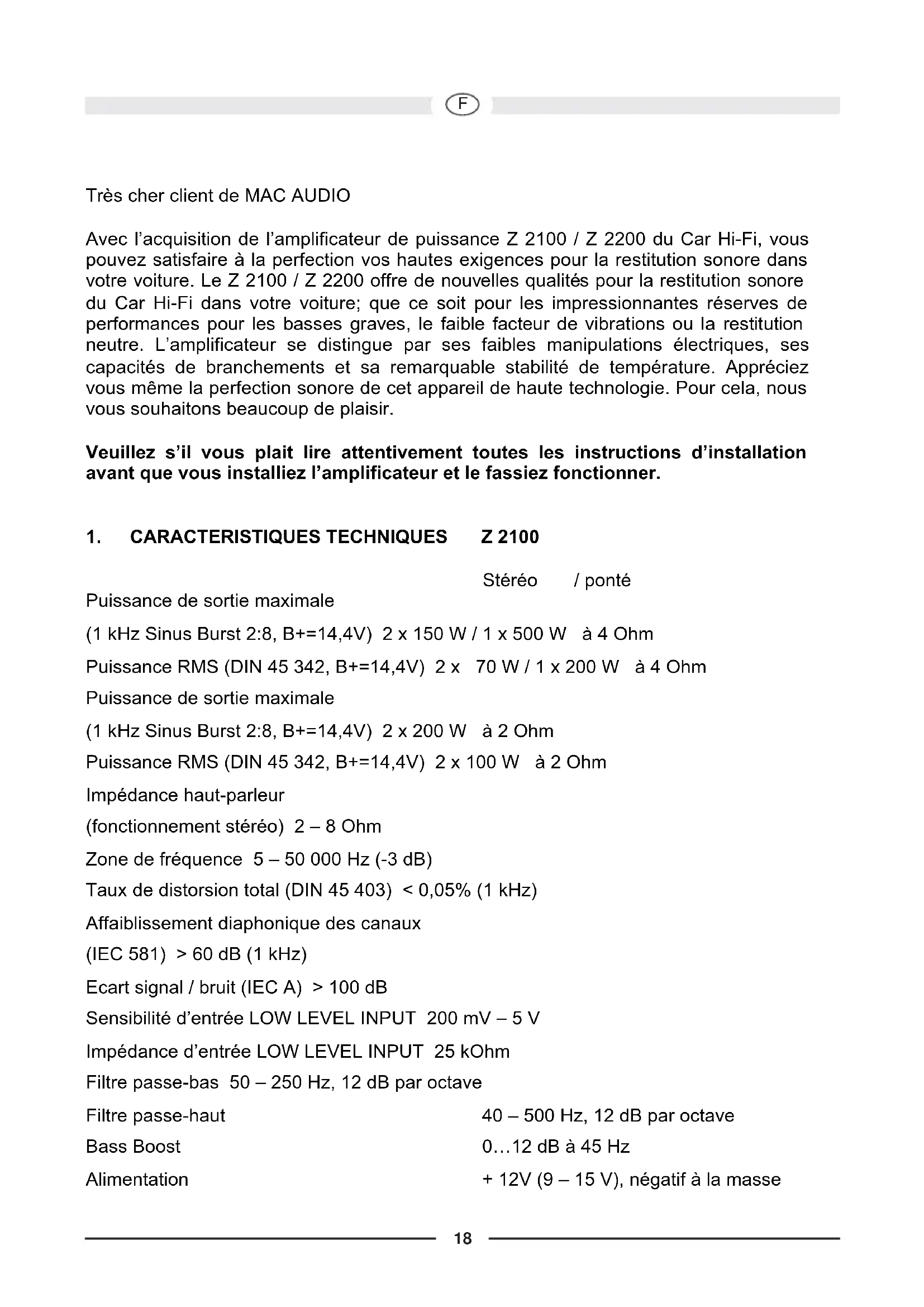 Très cher client de MAC AUDIO Avec l’acquisition de l’amplificateur de puissance Z 2100 / Z 2200 du Car Hi-Fi, vous pouvez satisfaire à la perfection vos hautes exigences pour la restitution sonore dans votre voiture. Le Z 2100 / Z 2200 offre de nouvelles qualités pour la restitution sonore du Car Hi-Fi dans votre voiture; que ce soit pour les impressionnantes réserves de performances pour les basses graves, le faible facteur de vibrations ou la restitution neutre. L’amplificateur se distingue par ses faibles manipulations électriques, ses capacités de branchements et sa remarquable stabilité de température. Appréciez vous même la perfection sonore de cet appareil de haute technologie. Pour cela, nous vous souhaitons beaucoup de plaisir. Veuillez s’il vous plait lire attentivement toutes les instructions d’installation avant que vous installiez l’amplificateur et le fassiez fonctionner.