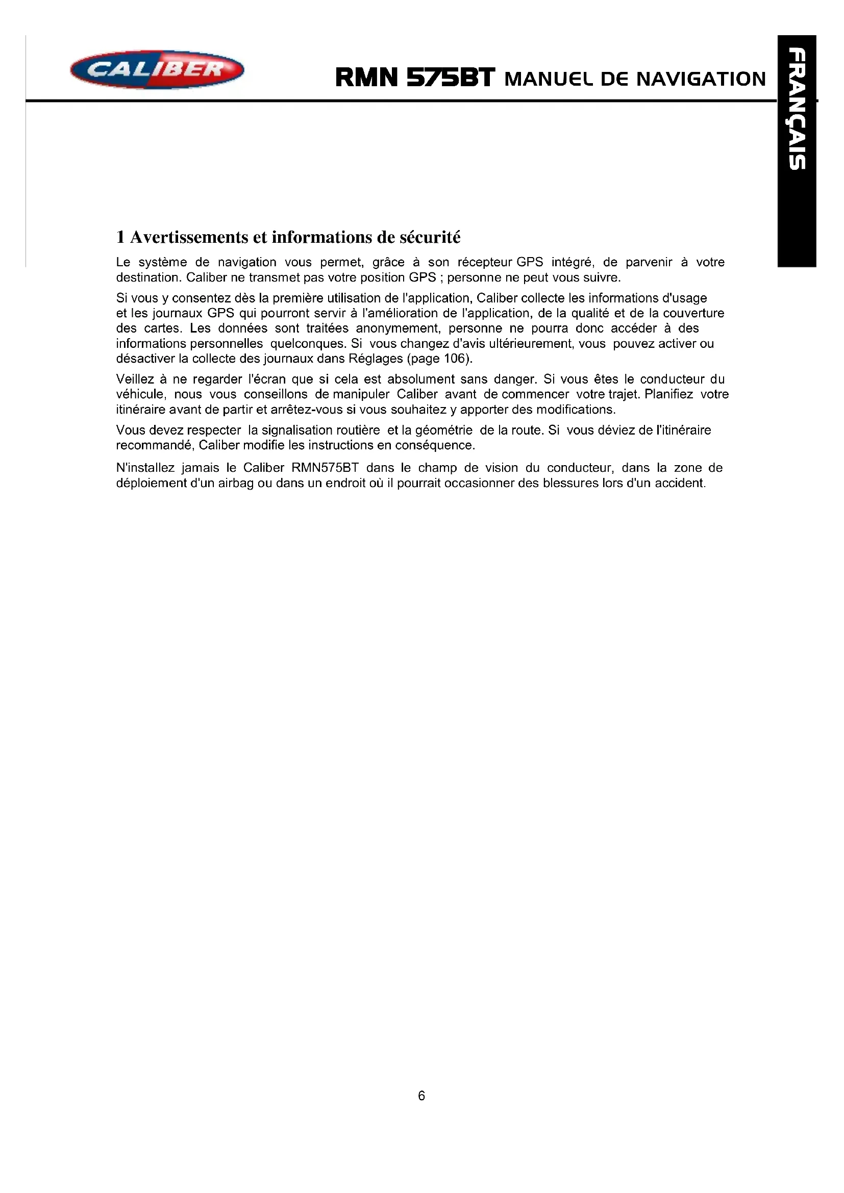 - Merci d'avoir choisi Caliber RMN575BT comme navigateur. Commencez à utiliser Caliber RMN575BT de suite. Ce document est la description détaillée du navigateur. Vous pouvez aisément découvrir Caliber tout en l'utilisant. Nous vous conseillons toutefois de lire ce manuel pour vous familiariser avec les écrans et les fonctions. 2RMN 575BT Manuel de navigation FRaNçais Table des matières 1 Avertissements et informations de sécurité p. 6