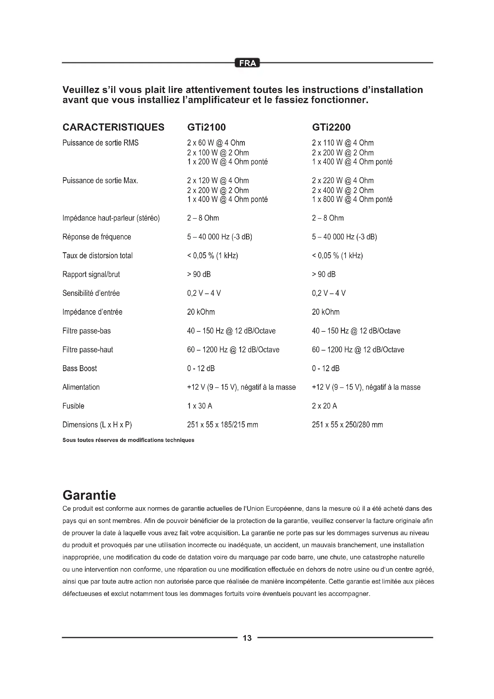 +12 V (9 – 15 V), négatif à la masse 1 x 30 A 251 x 55 x 185/215 mm Garantie Ce produit est conforme aux normes de garantie actuelles de l‘Union Européenne, dans la mesure où il a été acheté dans des pays qui en sont membres. Afin de pouvoir bénéficier de la protection de la garantie, veuillez conserver la facture originale afin de prouver la date à laquelle vous avez fait votre acquisition. La garantie ne porte pas sur les dommages survenus au niveau du produit et provoqués par une utilisation incorrecte ou inadéquate, un accident, un mauvais branchement, une installation inappropriée, une modification du code de datation voire du marquage par code barre, une chute, une catastrophe naturelle ou une intervention non conforme, une réparation ou une modification effectuée en dehors de notre usine ou d‘un centre agréé, ainsi que par toute autre action non autorisée parce que réalisée de manière incompétente. Cette garantie est limitée aux pièces défectueuses et exclut notamment tous les dommages fortuits voire éventuels pouvant les accompagner. Sous toutes réserves de modifications techniques GTi2200 2 x 110 W @ 4 Ohm 2 x 200 W @ 2 Ohm 1 x 400 W @ 4 Ohm ponté 2 x 220 W @ 4 Ohm 2 x 400 W @ 2 Ohm 1 x 800 W @ 4 Ohm ponté 2 – 8 Ohm 5 – 40 000 Hz (-3 dB) < 0,05 % (1 kHz) > 90 dB 0,2 V – 4 V 20 kOhm 40 – 150 Hz @ 12 dB/Octave 60 – 1200 Hz @ 12 dB/Octave