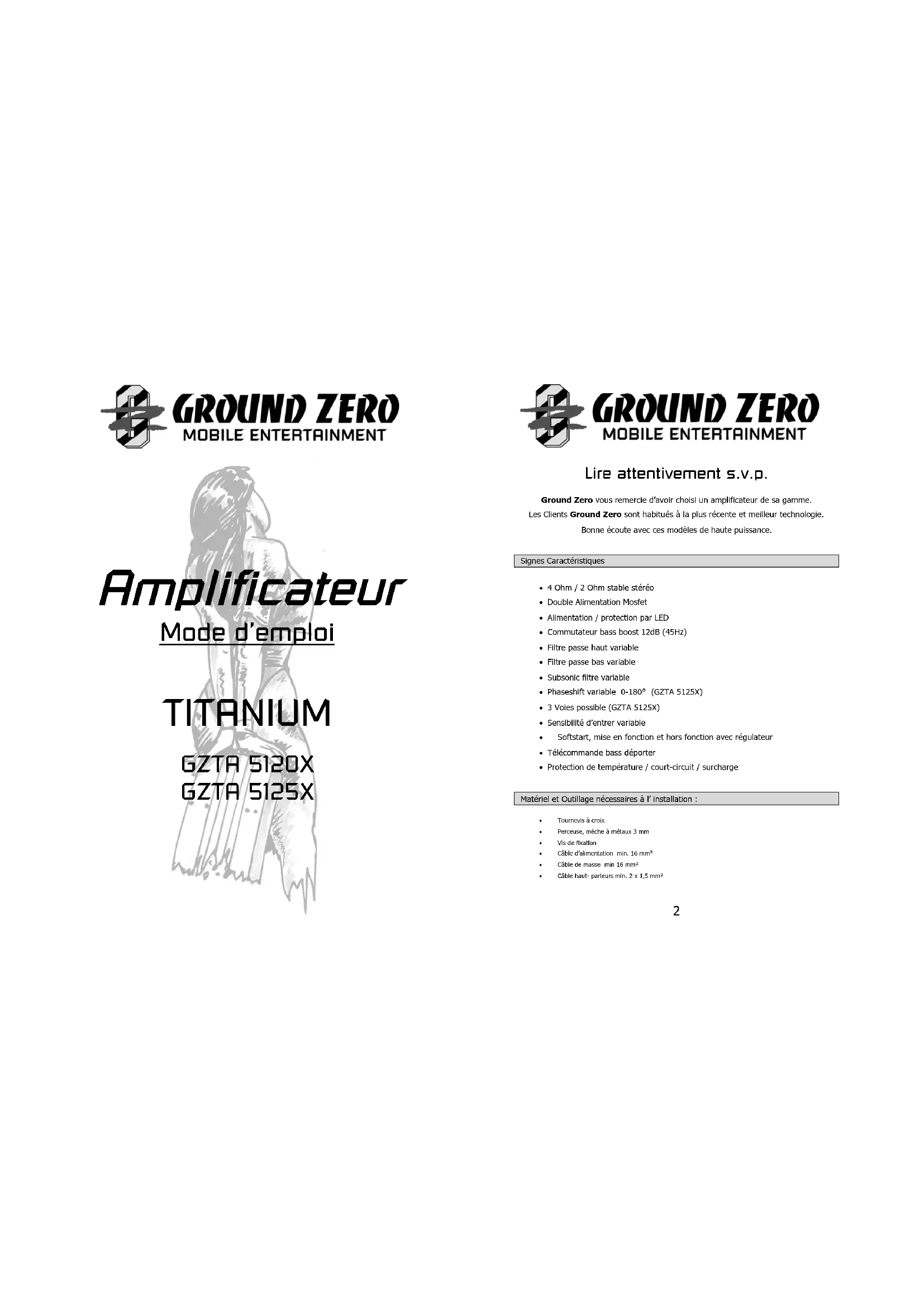 Lire attentivement s.v.p. Ground Zero vous remercie d’avoir choisi un amplificateur de sa gamme. Les Clients Ground Zero sont habitués à la plus récente et meilleur technologie. Bonne écoute avec ces modèles de haute puissance. Signes Caractéristiques