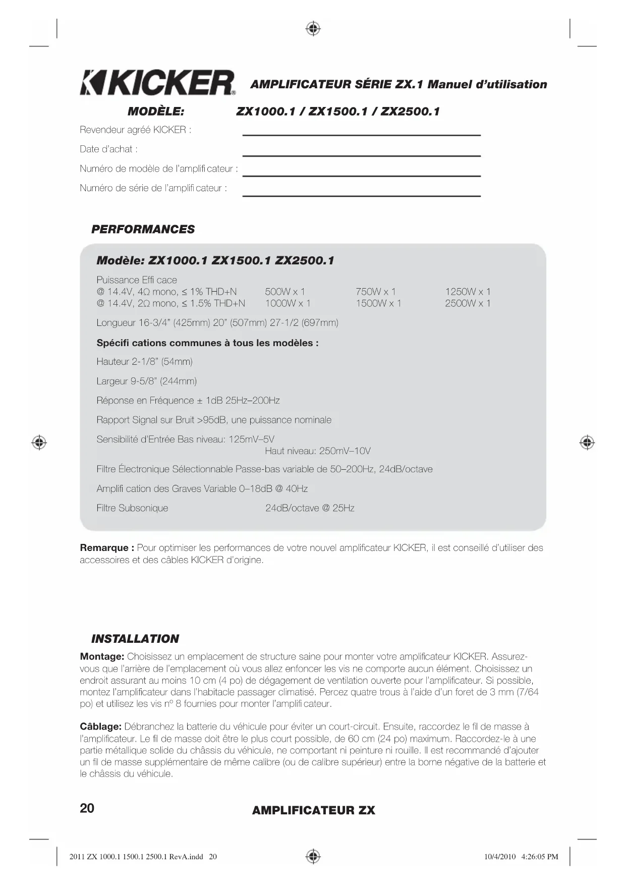 façon irréversible ! L’augmentation du volume d’un système jusqu’à un niveau présentant une distorsion audible endommage davantage l’ouïe que l’écoute d’un système sans distorsion au même volume. Le seuil de la douleur est toujours le signe que le niveau sonore est trop élevé et risque d’endommager l’ouïe de façon irréversible. Réglez le volume en faisant prevue de bon sens! L’expression “ carburant pour vivre plein pot “ fait référence au dynamisme de la marque KICKER d’équipements audio pour véhicules et a pour but d’encourager nos clients à faire le maximum (“ vivre plein pot “) dans tous les aspects de leur vie. Les haut-parleurs et amplifi cateurs KICKER sont les meilleurs dans le domaine des équipements audio et représentent donc pour nos client le “ carburant pour vivre plein pot “ dans l’aspect “ installation audio de véhicule “ de leur vie. Nous encourageons tous nos clients à respecter toutes les lois et réglementations locales relatives aux niveaux sonores acceptables à l’extérieur des véhicules. 2011 ZX 1000.1 1500.1 2500.1 RevA.indd 272011 ZX 1000.1 1500.1 2500.1 RevA.indd 27 10/4/2010 4:26:07 PM10/4/2010 4:26:07 PM©2010 Stillwater Designs 2011 ZX 1000.1 1500.1 2500.1 RevA.indd 282011 ZX 1000.1 1500.1 2500.1 RevA.indd 28 10/4/2010 4:26:07 PM10/4/2010 4:26:07 PM